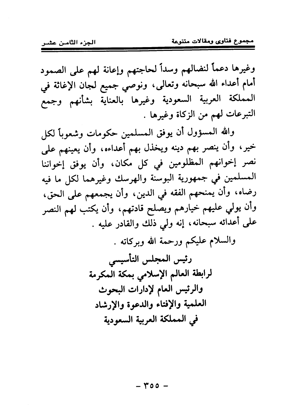 والله المسئول أن يوفق المسلمين حكومات وشعوبا لكل خير، وأن ينصر بهم دينه ويخذل بهم أعداءه، وأن يعينهم على نصر إخوانهم المظلومين في كل مكان، وأن يوفق إخواننا المسلمين في جمهورية البوسنة والهرسك وغيرهما لكل ما فيه رضاه، وأن يمنحهم الفقه في الدين، وأن يجمعهم على الحق، وأن يولي عليهم خيارهم ويصلح قادتهم، وأن يكتب لهم النصر على أعدائه سبحانه، إنه ولي ذلك والقادر عليه.