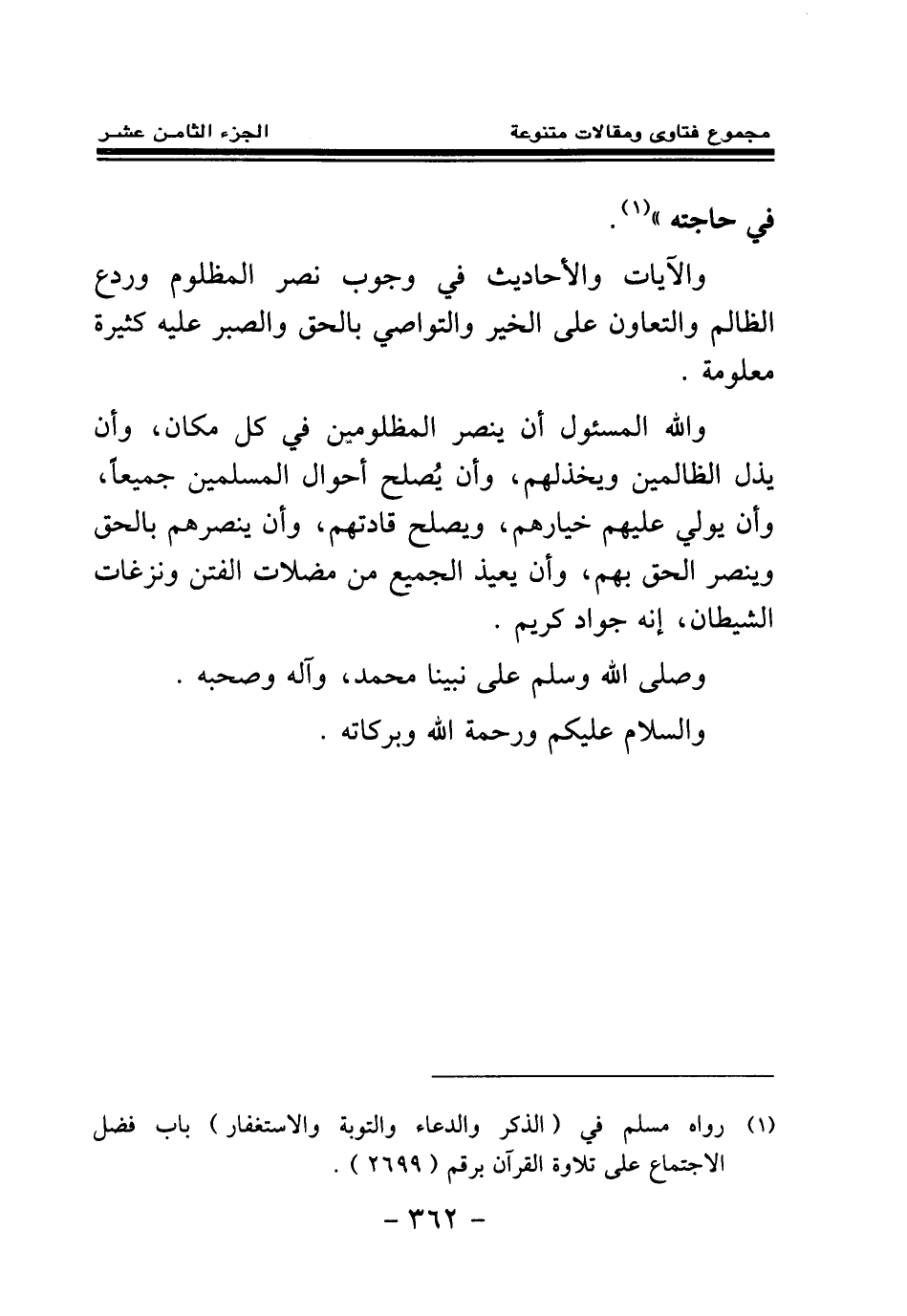والله المسئول أن ينصر المظلومين في كل مكان، وأن يذل الظالمين ويخذلهم، وأن يصلح أحوال المسلمين جميعا، وأن يولي عليهم خيارهم، ويصلح قادتهم، وأن ينصرهم بالحق وينصر الحق بهم، وأن يعيذ الجميع من مضلات الفتن ونزغات الشيطان، إنه جواد كريم.