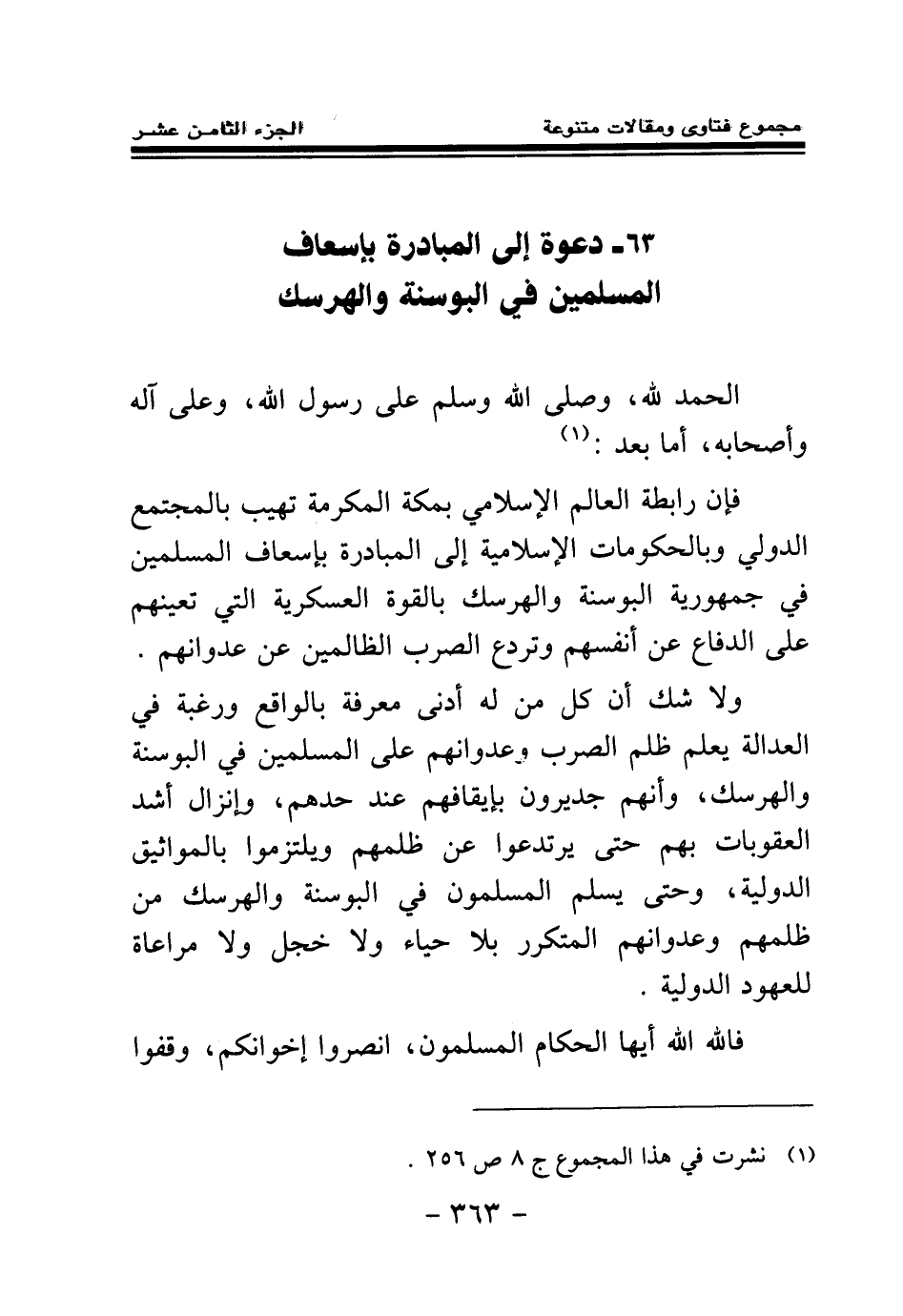 63 - دعوة إلى المبادرة بإسعاف المسلمين في البوسنة والهرسك