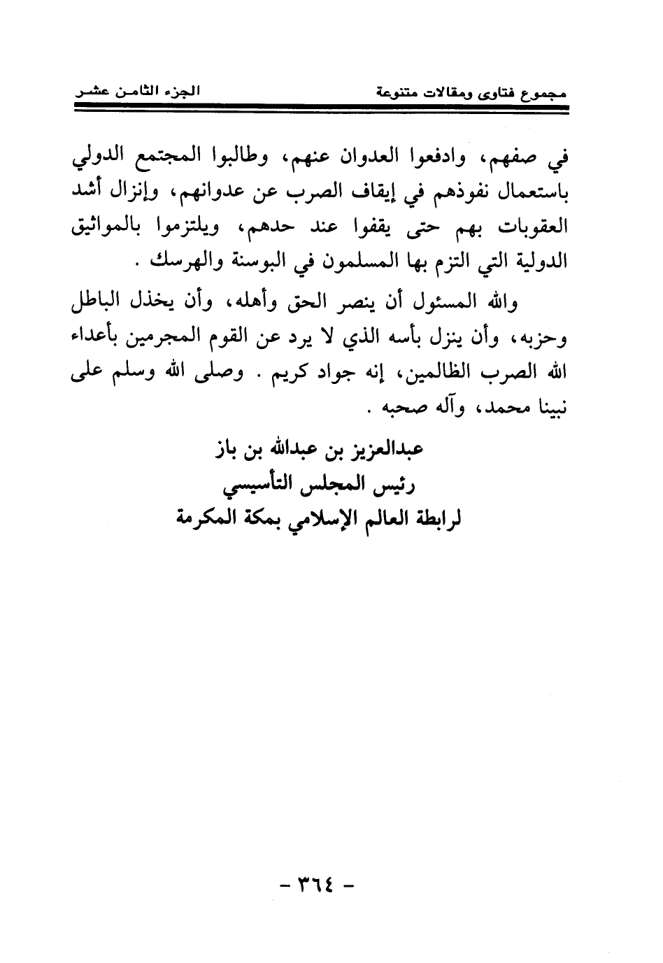 والله المسئول أن ينصر الحق وأهله، وأن يخذل الباطل وحزبه، وأن ينزل بأسه الذي لا يرد عن القوم المجرمين بأعداء الله الصرب الظالمين، إنه جواد كريم. وصلى الله وسلم على نبينا محمد، وآله صحبه.