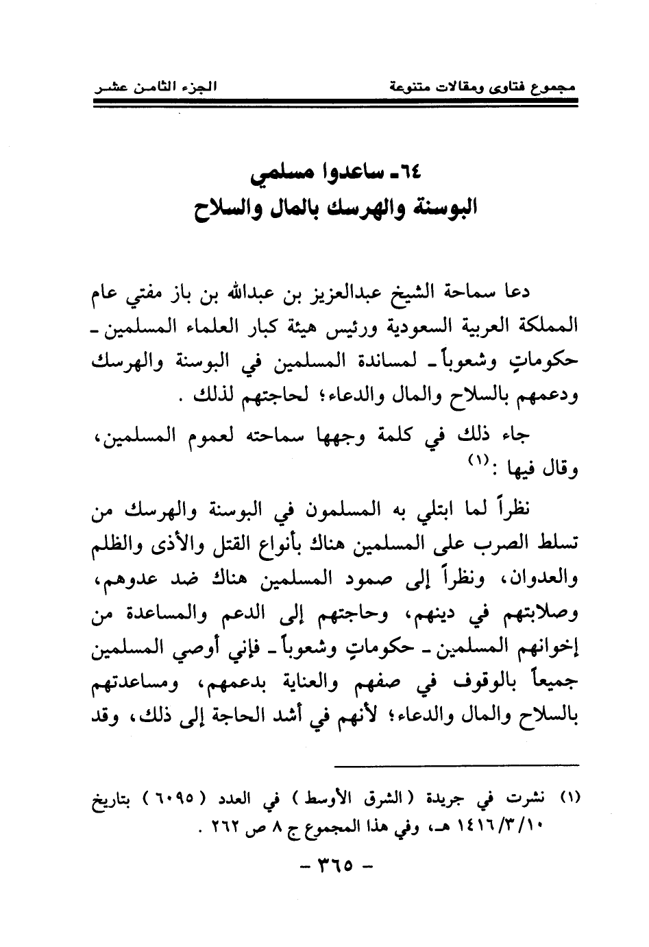 نظرا لما ابتلي به المسلمون في البوسنة والهرسك من تسلط الصرب على المسلمين هناك بأنواع القتل والأذى والظلم والعدوان، ونظرا إلى صمود المسلمين هناك ضد عدوهم، وصلابتهم في دينهم، وحاجتهم إلى الدعم والمساعدة من إخوانهم المسلمين- حكومات وشعوبا- فإني أوصي المسلمين جميعا بالوقوف في صفهم والعناية بدعمهم، ومساعدتهم بالسلاح والمال والدعاء لأنهم في أشد الحاجة إلى ذلك، وقد