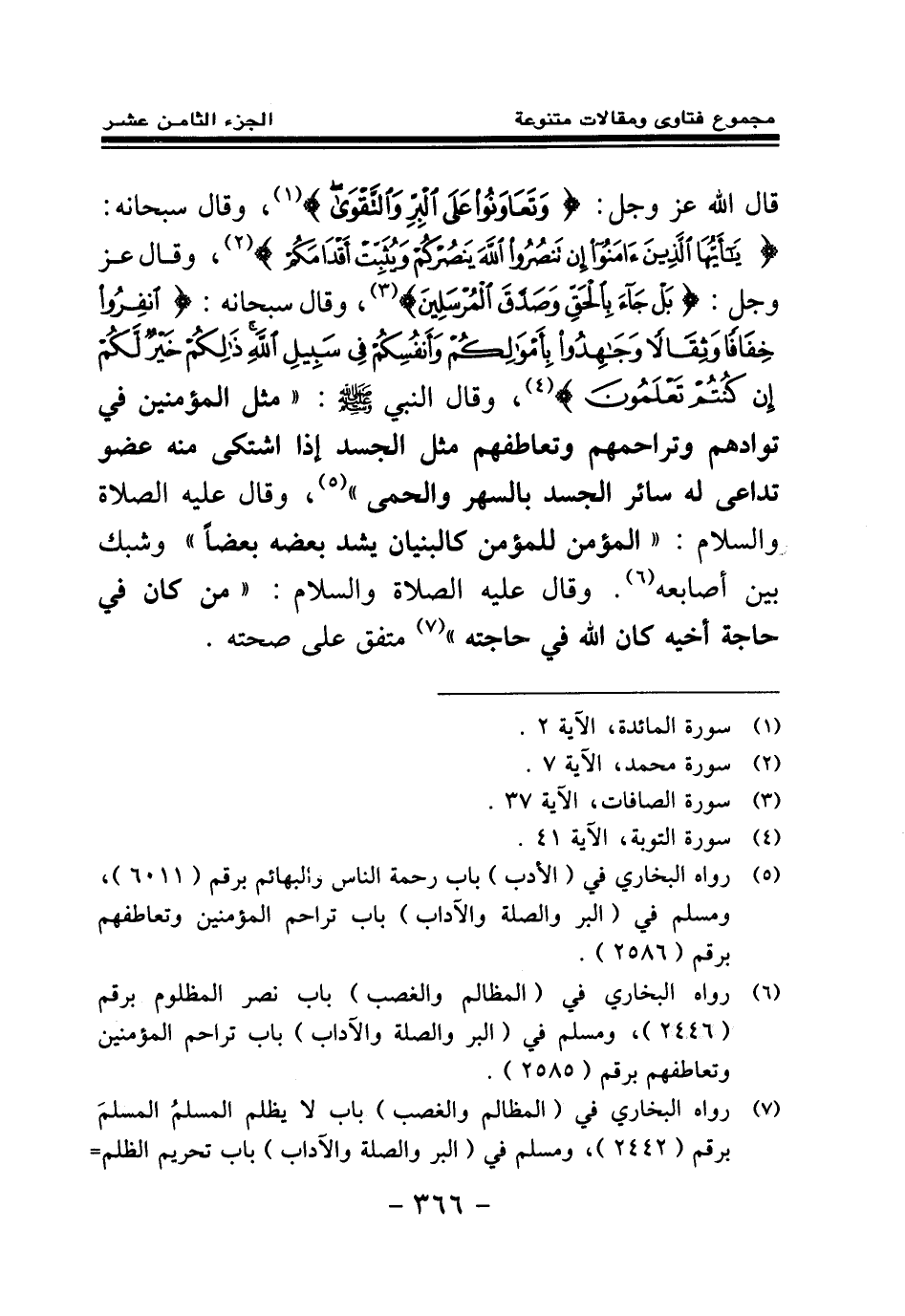 قال الله عز وجل: {وَتَعَاوَنُوا عَلَى الْبِرِّ وَالتَّقْوَى} (¬1) وقال سبحانه: {يَا أَيُّهَا الَّذِينَ آمَنُوا إِنْ تَنْصُرُوا اللَّهَ يَنْصُرْكُمْ وَيُثَبِّتْ أَقْدَامَكُمْ} (¬2) وقال عز وجل: {بَلْ جَاءَ بِالْحَقِّ وَصَدَّقَ الْمُرْسَلِينَ} (¬3) وقال سبحانه: {انْفِرُوا خِفَافًا وَثِقَالًا وَجَاهِدُوا بِأَمْوَالِكُمْ وَأَنْفُسِكُمْ فِي سَبِيلِ اللَّهِ ذَلِكُمْ خَيْرٌ لَكُمْ إِنْ كُنْتُمْ تَعْلَمُونَ} (¬4) وقال النبي صلى الله عليه وسلم: «مثل المؤمنين في توادهم وتراحمهم وتعاطفهم مثل الجسد إذا اشتكى منه عضو تداعى له سائر الجسد بالسهر والحمى (¬5) » . وقال عليه الصلاة والسلام: «المؤمن للمؤمن كالبنيان يشد بعضه بعضا. وشبك بين أصابعه (¬6) » . وقال عليه الصلاة والسلام: «من كان في حاجة أخيه كان الله في حاجته (¬7) » . متفق على صحته.