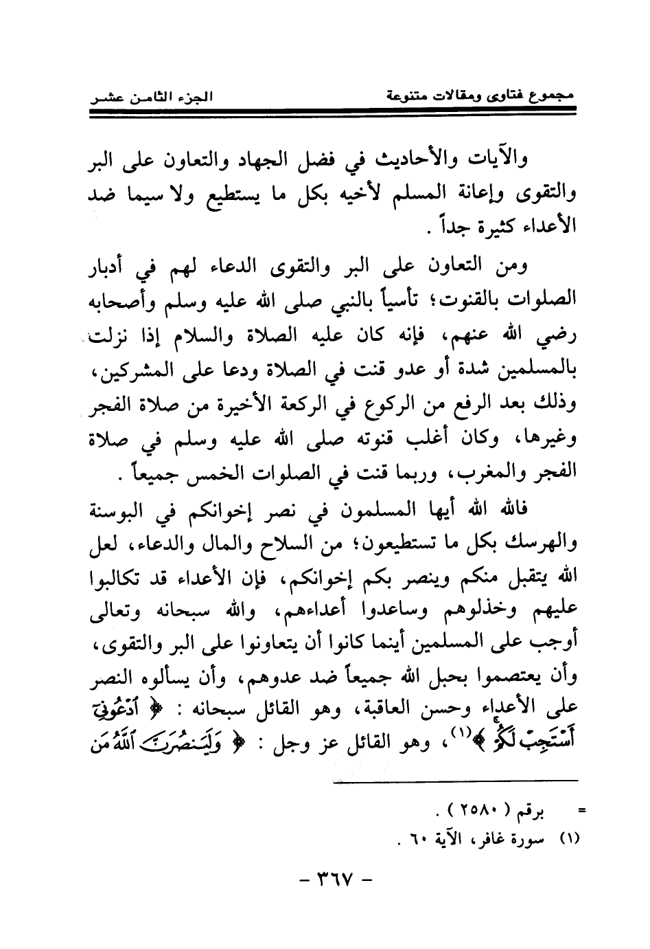 والآيات والأحاديث في فضل الجهاد والتعاون على البر والتقوى وإعانة المسلم لأخيه بكل ما يستطيع ولا سيما ضد الأعداء كثيرة جدا.