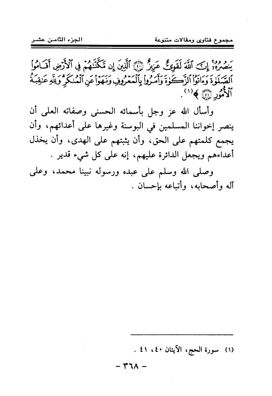 {وَلَيَنْصُرَنَّ اللَّهُ مَنْ يَنْصُرُهُ إِنَّ اللَّهَ لَقَوِيٌّ عَزِيزٌ} (¬1) {الَّذِينَ إِنْ مَكَّنَّاهُمْ فِي الْأَرْضِ أَقَامُوا الصَّلَاةَ وَآتَوُا الزَّكَاةَ وَأَمَرُوا بِالْمَعْرُوفِ وَنَهَوْا عَنِ الْمُنْكَرِ وَلِلَّهِ عَاقِبَةُ الْأُمُورِ} (¬2)
