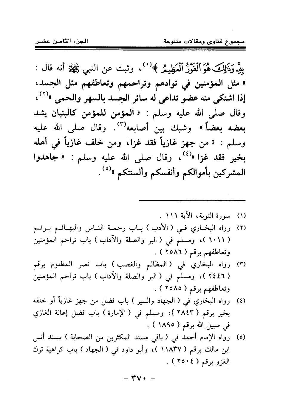 وثبت عن النبي صلى الله عليه وسلم أنه قال: «مثل المؤمنين في توادهم وتراحمهم وتعاطفهم مثل الجسد، إذا اشتكى منه عضو تداعى له سائر الجسد بالسهر والحمى (¬1) » . وقال صلى الله عليه وسلم: «المؤمن للمؤمن كالبنيان يشد بعضه بعضا. وشبك بين أصابعه (¬2) » . وقال صلى الله عليه وسلم: «من جهز غازيا فقد غزا، ومن خلف غازيا في أهله بخير فقد غزا (¬3) » . وقال صلى الله عليه وسلم: «جاهدوا المشركين بأموالكم وأنفسكم وألسنتكم (¬4) » .