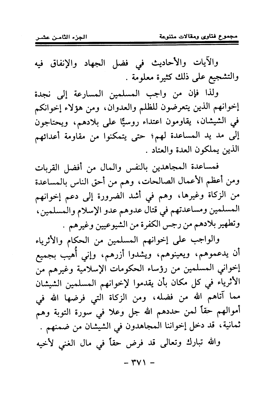 والواجب على إخوانهم المسلمين من الحكام والأثرياء أن يدعموهم، ويعينوهم، ويشدوا أزرهم، وإني أهيب بجميع إخواني المسلمين من رؤساء الحكومات الإسلامية وغيرهم من الأثرياء في كل مكان بأن يقدموا لإخوانهم المسلمين الشيشان مما آتاهم الله من فضله، ومن الزكاة التي فرضها الله في أموالهم حقا لمن حددهم الله جل وعلا في سورة التوبة وهم ثمانية، قد دخل إخواننا المجاهدون في الشيشان من ضمنهم.