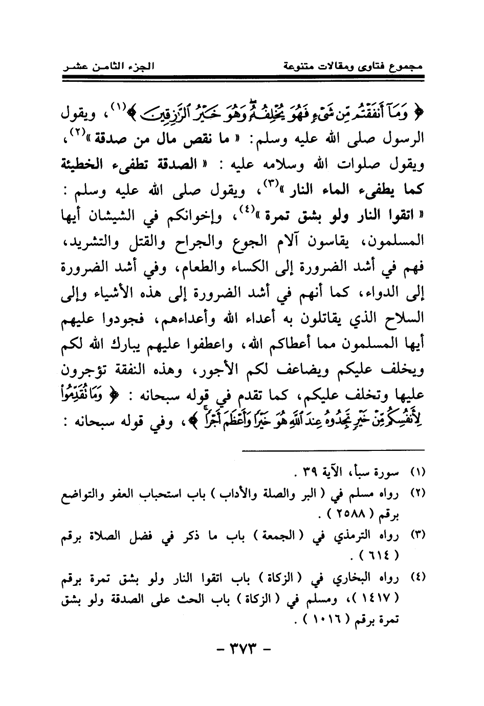 {وَمَا أَنْفَقْتُمْ مِنْ شَيْءٍ فَهُوَ يُخْلِفُهُ وَهُوَ خَيْرُ الرَّازِقِينَ} (¬1) ويقول الرسول صلى الله عليه وسلم: «ما نقص مال من صدقة (¬2) » . ويقول صلوات الله وسلامه عليه: «الصدقة تطفئ الخطيئة كما يطفئ الماء النار (¬3) » ويقول صلى الله عليه وسلم: «اتقوا النار ولو بشق تمرة (¬4) » . وإخوانكم في الشيشان أيها المسلمون، يقاسون آلام الجوع والجراح والقتل والتشريد، فهم في أشد الضرورة إلى الكساء والطعام، وفي أشد الضرورة إلى الدواء، كما أنهم في أشد الضرورة إلى هذه الأشياء وإلى السلاح الذي يقاتلون به أعداء الله وأعداءهم، فجودوا عليهم أيها المسلمون مما أعطاكم الله، واعطفوا عليهم يبارك الله لكم ويخلف عليكم ويضاعف لكم الأجور، وهذه النفقة تؤجرون عليها وتخلف عليكم، كما تقدم في قوله سبحانه: {وَمَا تُقَدِّمُوا لِأَنْفُسِكُمْ مِنْ خَيْرٍ تَجِدُوهُ عِنْدَ اللَّهِ هُوَ خَيْرًا وَأَعْظَمَ أَجْرًا} (¬5) وفي قوله سبحانه: