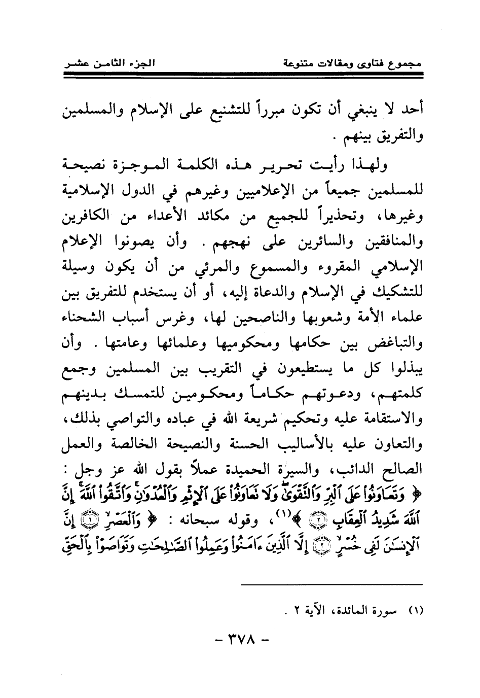 ولهذا رأيت تحرير هذه الكلمة الموجزة نصيحة المسلمين جميعا من الإعلاميين وغيرهم في الدول الإسلامية وغيرها، وتحذيرا للجميع من مكائد الأعداء من الكافرين والمنافقين والسائرين على نهجهم. وأن يصونوا الإعلام الإسلامي المقروء والمسموع والمرئي من أن يكون وسيلة للتشكيك في الإسلام والدعاة إليه، أو أن يستخدم للتفريق بين علماء الأمة وشعوبها والناصحين لها، وغرس أسباب الشحناء والتباغض بين حكامها ومحكوميها وعلمائها وعامتها. وأن يبذلوا كل ما يستطيعون في التقريب بين المسلمين وجمع كلمتهم، ودعوتهم حكاما ومحكومين للتمسك بدينهم والاستقامة عليه وتحكيم شريعة الله في عباده والتواصي بذلك، والتعاون عليه بالأساليب الحسنة والنصيحة الخالصة والعمل الصالح الدائب، والسليمة الحميدة عملا بقول الله عز وجل: {وَتَعَاوَنُوا عَلَى الْبِرِّ وَالتَّقْوَى وَلَا تَعَاوَنُوا عَلَى الْإِثْمِ وَالْعُدْوَانِ وَاتَّقُوا اللَّهَ إِنَّ اللَّهَ شَدِيدُ الْعِقَابِ} (¬1) وقوله سبحانه: {وَالْعَصْرِ} (¬2) {إِنَّ الْإِنْسَانَ لَفِي خُسْرٍ} (¬3) {إِلَّا الَّذِينَ آمَنُوا وَعَمِلُوا الصَّالِحَاتِ وَتَوَاصَوْا بِالْحَقِّ وَتَوَاصَوْا بِالصَّبْرِ} (¬4)