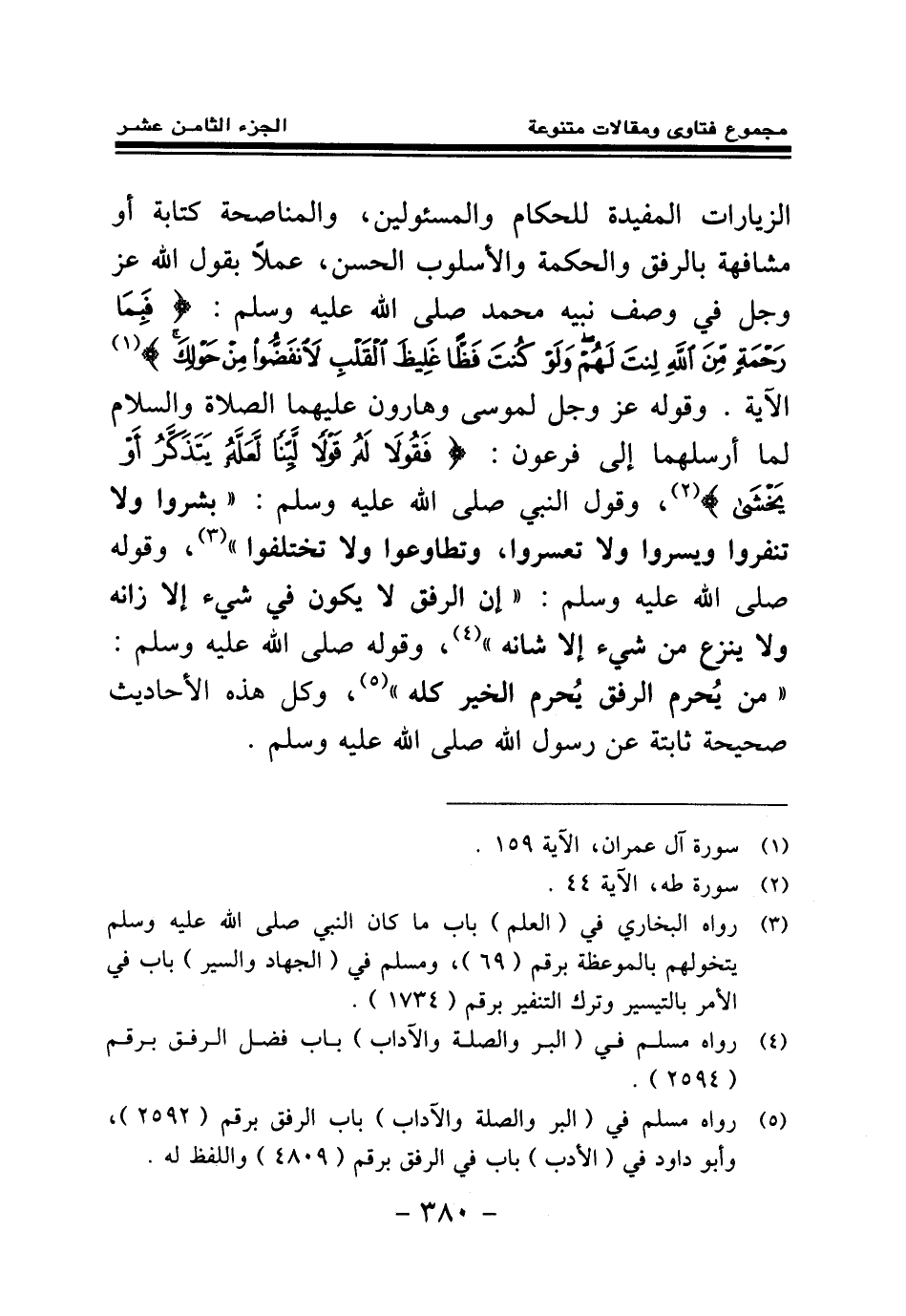الزيارات المفيدة للحكام والمسئولين، والمناصحة كتابة أو مشافهة بالرفق والحكمة والأسلوب الحسن، عملا بقول الله عز وجل في وصف نبيه محمد صلى الله عليه وسلم: {فَبِمَا رَحْمَةٍ مِنَ اللَّهِ لِنْتَ لَهُمْ وَلَوْ كُنْتَ فَظًّا غَلِيظَ الْقَلْبِ لَانْفَضُّوا مِنْ حَوْلِكَ} (¬1) الآية. وقوله عز وجل لموسى وهارون عليهما الصلاة والسلام لما أرسلهما إلى فرعون: {فَقُولَا لَهُ قَوْلًا لَيِّنًا لَعَلَّهُ يَتَذَكَّرُ أَوْ يَخْشَى} (¬2) وقول النبي صلى الله عليه وسلم: «بشروا ولا تنفروا ويسروا ولا تعسروا، وتطاوعوا ولا تختلفوا (¬3) » . وقوله صلى الله عليه وسلم: «إن الرفق لا يكون في شيء إلا زانه ولا ينزع من شيء إلا شانه (¬4) » ، وقوله صلى الله عليه وسلم: «من يحرم الرفق يحرم الخير كله (¬5) » . وكل هذه الأحاديث صحيحة ثابتة عن رسول الله صلى الله عليه وسلم.