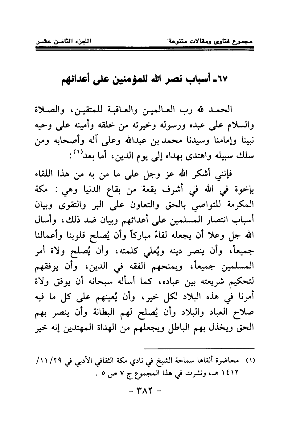 فإنني أشكر الله عز وجل على ما من به من هذا اللقاء بإخوة في الله في أشرف بقعة من بقاع الدنيا وهي: مكة المكرمة للتواصي بالحق والتعاون على البر والتقوى وبيان أسباب انتصار المسلمين على أعدائهم وبيان ضد ذلك، وأسال الله جل وعلا أن يجعله لقاء مباركا وأن يصلح قلوبنا وأعمالنا جميعا، وأن ينصر دينه ويعلي كلمته، وأن يصلح ولاة أمر المسلمين جميعا، ويمنحهم الفقه في الدين، وأن يوفقهم لتحكيم شريعته بين عباده، كما أسأله سبحانه أن يوفق ولاة أمرنا في هذه البلاد لكل خير، وأن يعينهم على كل ما فيه صلاح العباد والبلاد وأن يصلح لهم البطانة وأن ينصر بهم الحق ويخذل بهم الباطل ويجعلهم من الهداة المهتدين إنه خير