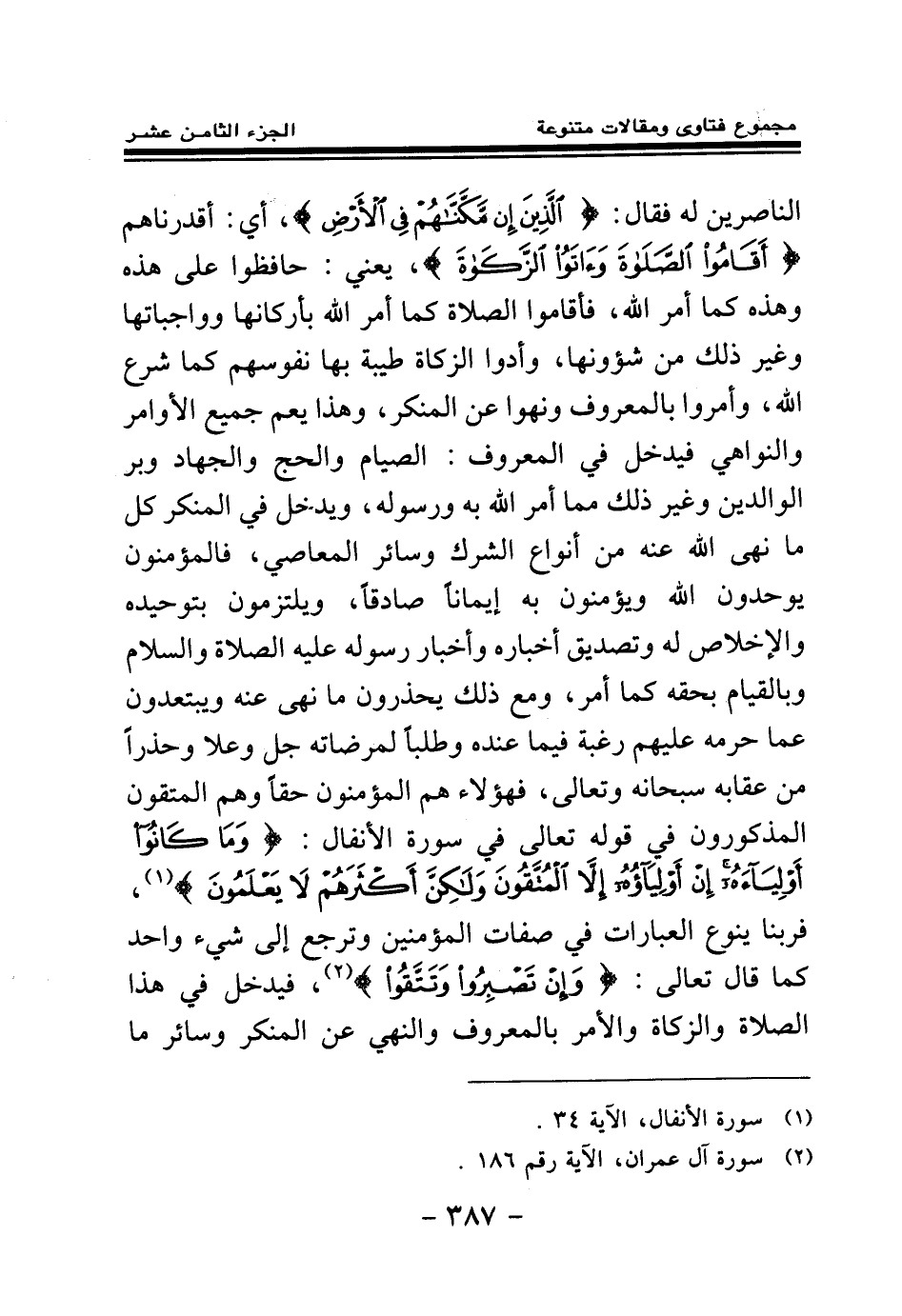 الناصرين له فقال: {الَّذِينَ إِنْ مَكَّنَّاهُمْ فِي الْأَرْضِ} (¬1) أي: أقدرناهم {أَقَامُوا الصَّلَاةَ وَآتَوُا الزَّكَاةَ} (¬2) يعني: حافظوا على هذه وهذه كما أمر الله، فأقاموا الصلاة كما أمر الله بأركانها وواجباتها وغير ذلك من شئونها، وأدوا الزكاة طيبة بها نفوسهم كما شرع الله، وأمروا بالمعروف ونهوا عن المنكر، وهذا يعم جميع الأوامر والنواهي فيدخل في المعروف: الصيام والحج والجهاد وبر الوالدين وغير ذلك مما أمر الله به ورسوله، ويدخل في المنكر كل ما نهى الله عنه من أنواع الشرك وسائر المعاصي، فالمؤمنون يوحدون الله ويؤمنون به إيمانا صادقا، ويلتزمون بتوحيده والإخلاص له وتصديق أخباره وأخبار رسوله عليه الصلاة والسلام وبالقيام بحقه كما أمر، ومع ذلك يحذرون ما نهى عنه ويبتعدون عما حرمه عليهم رغبة فيما عنده وطلبا لمرضاته جل وعلا وحذرا من عقابه سبحانه وتعالى، فهؤلاء هم المؤمنون حقا وهم المتقون المذكورون في قوله تعالى في سورة الأنفال: {وَمَا كَانُوا أَوْلِيَاءَهُ إِنْ أَوْلِيَاؤُهُ إِلَّا الْمُتَّقُونَ وَلَكِنَّ أَكْثَرَهُمْ لَا يَعْلَمُونَ} (¬3) فربنا ينوع العبارات في صفات المؤمنين وترجع إلى شيء واحد كما قال تعالى: {وَإِنْ تَصْبِرُوا وَتَتَّقُوا} (¬4) فيدخل في هذا الصلاة والزكاة والأمر بالمعروف والنهي عن المنكر وسائر ما