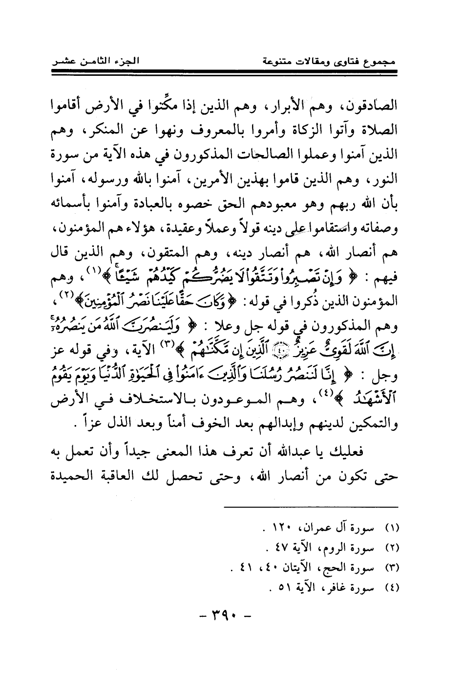 الصادقون، وهم الأبرار، وهم الذين إذا مكنوا في الأرض أقاموا الصلاة وآتوا الزكاة وأمروا بالمعروف ونهوا عن المنكر، وهم الذين آمنوا وعملوا الصالحات المذكورون في هذه الآية من سورة النور، وهم الذين قاموا بهذين الأمرين، آمنوا بالله ورسوله، آمنوا بأن الله ربهم وهو معبودهم الحق خصوه بالعبادة وآمنوا بأسمائه وصفاته واستقاموا على دينه قولا وعملا وعقيدة، هؤلاء هم المؤمنون، هم أنصار الله، هم أنصار دينه، وهم المتقون، وهم الذين قال فيهم: {وَإِنْ تَصْبِرُوا وَتَتَّقُوا لَا يَضُرُّكُمْ كَيْدُهُمْ} (¬1) وهم المؤمنون الذين ذكروا في قوله: {وَكَانَ حَقًّا عَلَيْنَا نَصْرُ الْمُؤْمِنِينَ} (¬2) وهم المذكورون في قوله جل وعلا: {وَلَيَنْصُرَنَّ اللَّهُ مَنْ يَنْصُرُهُ إِنَّ اللَّهَ لَقَوِيٌّ عَزِيزٌ} (¬3) {الَّذِينَ إِنْ مَكَّنَّاهُمْ} (¬4) الآية، وفي قوله عز وجل: {إِنَّا لَنَنْصُرُ رُسُلَنَا وَالَّذِينَ آمَنُوا فِي الْحَيَاةِ الدُّنْيَا وَيَوْمَ يَقُومُ الْأَشْهَادُ} (¬5) وهم الموعودون بالاستخلاف في الأرض والتمكين لدينهم وإبدالهم بعد الخوف أمنا وبعد الذل عزا.