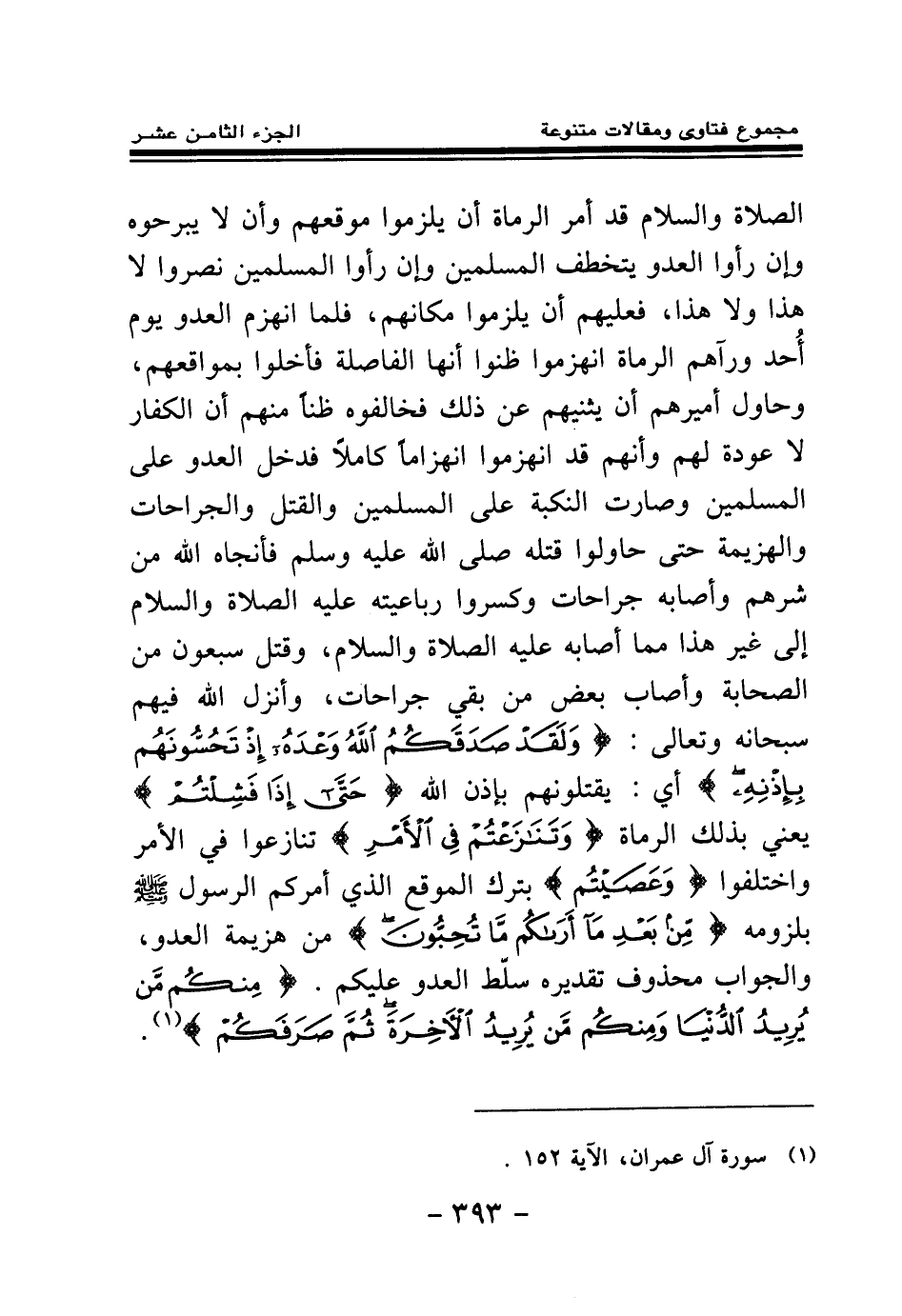 الصلاة والإسلام قد أمر الرماة أن يلزموا موقعهم وأن لا يبرحوه وإن رأوا العدو يتخطف المسلمين، وإن رأوا المسلمين نصروا لا هذا ولا هذا، فعليهم أن يلزموا مكانهم، فلما انهزم العدو يوم أحد ورآهم الرماة انهزموا ظنوا أنها الفاصلة فأخلوا بمواقعهم، وحاول أميرهم أن يثنيهم عن ذلك فخالفوه ظنا منهم أن الكفار لا عودة لهم وأنهم قد انهزموا انهزاما كاملا فدخل العدو على المسلمين وصارت النكبة على المسلمين والقتل والجراحات والهزيمة حتى حاولوا قتله صلى الله عليه وسلم فأنجاه الله من شرهم وأصابه جراحات وكسروا رباعيته عليه الصلاة والسلام إلى غير هذا مما أصابه عليه الصلاة والسلام، وقتل سبعون من الصحابة وأصاب بعض من بقي جراحات، وأنزل الله فيهم سبحانه وتعالى: {وَلَقَدْ صَدَقَكُمُ اللَّهُ وَعْدَهُ إِذْ تَحُسُّونَهُمْ بِإِذْنِهِ} (¬1) أي: يقتلونهم بإذن الله {حَتَّى إِذَا فَشِلْتُمْ} (¬2) يعني بذلك الرماة {وَتَنَازَعْتُمْ فِي الْأَمْرِ} (¬3) تنازعوا في الأمر واختلفوا {وَعَصَيْتُمْ} (¬4) بترك الموقع الذي أمركم الرسول صلى الله عليه وسلم بلزومه {مِنْ بَعْدِ مَا أَرَاكُمْ مَا تُحِبُّونَ} (¬5) من هزيمة العدو، والجواب محذوف تقديره سلط العدو عليكم. {مِنْكُمْ مَنْ يُرِيدُ الدُّنْيَا وَمِنْكُمْ مَنْ يُرِيدُ الْآخِرَةَ ثُمَّ صَرَفَكُمْ} (¬6)