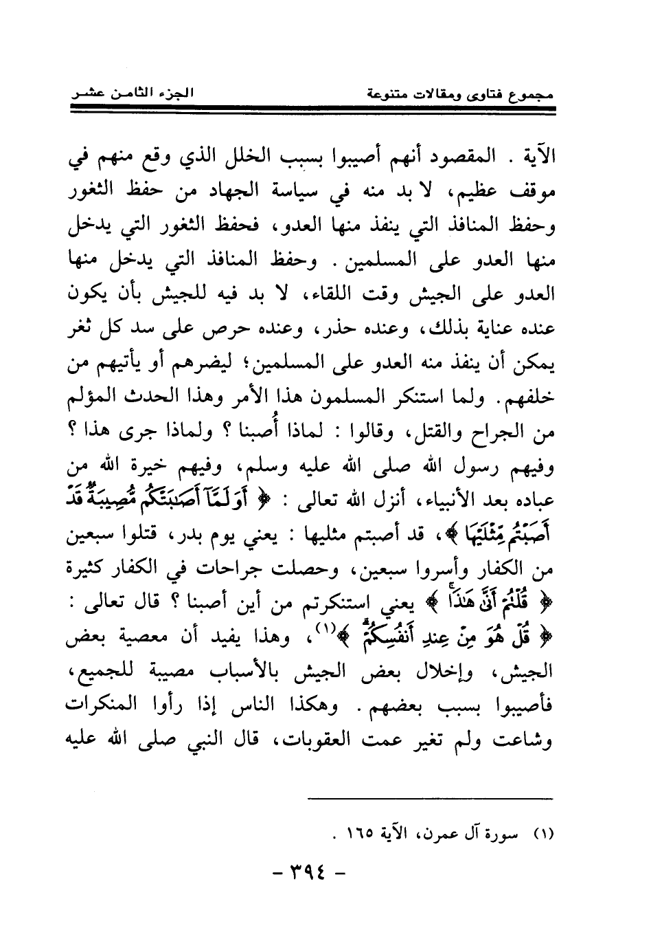 الآية. المقصود أنهم أصيبوا بسبب الخلل الذي وقع منهم في موقف عظيم، لا بد منه في سياسة الجهاد من حفظ الثغور وحفظ المنافذ التي ينفذ منها العدو، فحفظ الثغور التي يدخل منها العدو على المسلمين. وحفظ المنافذ التي يدخل منها العدو على الجيش وقت اللقاء، لا بد فيه للجيش بأن يكون عنده عناية بذلك، وعنده حذر، وعنده حرص على سد كل ثغر يمكن أن ينفذ منه العدو على المسلمين ليضرهم أو يأتيهم من خلفهم. ولما استنكر المسلمون هذا الأمر وهذا الحدث المؤلم من الجراح والقتل، وقالوا: لماذا أصبنا؟ ولماذا جرى هذا؟ وفيهم رسول الله صلى الله عليه وسلم، وفيهم خيرة الله من عباده بعد الأنبياء، أنزل الله تعالى: {أَوَلَمَّا أَصَابَتْكُمْ مُصِيبَةٌ قَدْ أَصَبْتُمْ مِثْلَيْهَا} (¬1) قد أصبتم مثليها: يعني يوم بدر، قتلوا سبعين من الكفار وأسروا سبعين، وحصلت جراحات في الكفار كثيرة {قُلْتُمْ أَنَّى هَذَا} (¬2) يعني استنكرتم من أين أصبنا؟ قال تعالى: {قُلْ هُوَ مِنْ عِنْدِ أَنْفُسِكُمْ} (¬3) وهذا يفيد أن معصية بعض الجيش، وإخلال بعض الجيش بالأسباب مصيبة للجميع، فأصيبوا بسبب بعضهم. وهكذا الناس إذا رأوا المنكرات وشاعت ولم تغير عمت العقوبات، قال النبي صلى الله عليه