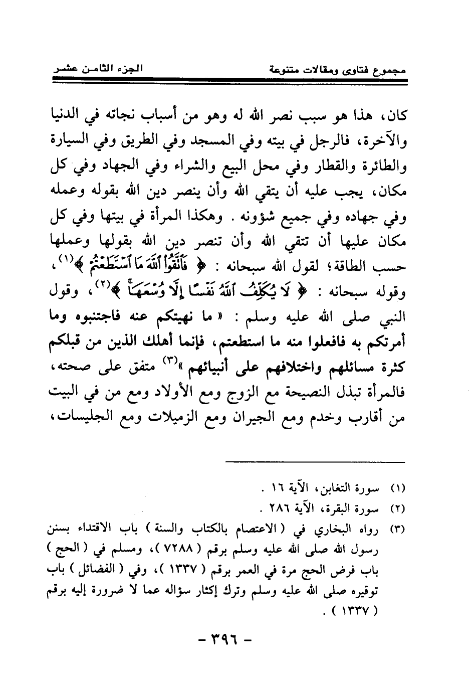كان، هذا هو سبب نصر الله له وهو من أسباب نجاته في الدنيا والآخرة، فالرجل في بيته وفي المسجد وفي الطريق وفي السيارة والطائرة والقطار وفي محل البيع والشراء وفي الجهاد وفي كل مكان، يجب عليه أن يتقي الله وأن ينصر دين الله بقوله وعمله وفي جهاده وفي جميع شئونه. وهكذا المرأة في بيتها وفي كل مكان عليها أن تتقي الله وأن تنصر دين الله بقولها وعملها حسب الطاقة لقول الله سبحانه: {فَاتَّقُوا اللَّهَ مَا اسْتَطَعْتُمْ} (¬1) وقوله سبحانه: {لَا يُكَلِّفُ اللَّهُ نَفْسًا إِلَّا وُسْعَهَا} (¬2) وقول النبي صلى الله عليه وسلم: «ما نهيتكم عنه فاجتنبوه وما أمرتكم به فافعلوا منه ما استطعتم، فإنما أهلك الذين من قبلكم كثرة مسائلهم واختلافهم على أنبيائهم (¬3) » متفق على صحته، فالمرأة تبذل النصيحة مع الزوج ومع الأولاد ومع من في البيت من أقارب وخدم ومع الجيران ومع الزميلات ومع الجليسات،