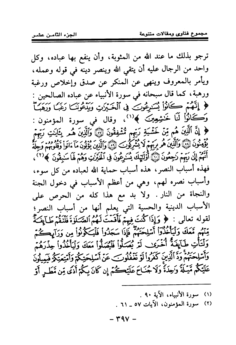 ترجو بذلك ما عند الله من المثوبة، وأن ينفع بها عباده، وكل واحد من الرجال عليه أن يتقي الله وينصر دينه في قوله وعمله، ويأمر بالمعروف وينهى عن المنكر عن صدق وإخلاص ورغبة ورهبة، كما قال سبحانه في سورة الأنبياء عن عباده الصالحين: {إِنَّهُمْ كَانُوا يُسَارِعُونَ فِي الْخَيْرَاتِ وَيَدْعُونَنَا رَغَبًا وَرَهَبًا وَكَانُوا لَنَا خَاشِعِينَ} (¬1) وقال في سورة المؤمنون: {إِنَّ الَّذِينَ هُمْ مِنْ خَشْيَةِ رَبِّهِمْ مُشْفِقُونَ} (¬2) {وَالَّذِينَ هُمْ بِآيَاتِ رَبِّهِمْ يُؤْمِنُونَ} (¬3) {وَالَّذِينَ هُمْ بِرَبِّهِمْ لَا يُشْرِكُونَ} (¬4) {وَالَّذِينَ يُؤْتُونَ مَا آتَوْا وَقُلُوبُهُمْ وَجِلَةٌ أَنَّهُمْ إِلَى رَبِّهِمْ رَاجِعُونَ} (¬5) {أُولَئِكَ يُسَارِعُونَ فِي الْخَيْرَاتِ وَهُمْ لَهَا سَابِقُونَ} (¬6) فهذه أسباب النصر، هذه أسباب حماية الله لعباده من كل سوء، وأسباب نصره لهم، وهي من أعظم الأسباب في دخول الجنة والنجاة من النار. ولا بد مع هذا كله من الحرص على الأسباب الدينية والحسية التي يعلم أنها من أسباب النصر؟ لقوله تعالى: {وَإِذَا كُنْتَ فِيهِمْ فَأَقَمْتَ لَهُمُ الصَّلَاةَ فَلْتَقُمْ طَائِفَةٌ مِنْهُمْ مَعَكَ وَلْيَأْخُذُوا أَسْلِحَتَهُمْ فَإِذَا سَجَدُوا فَلْيَكُونُوا مِنْ وَرَائِكُمْ وَلْتَأْتِ طَائِفَةٌ أُخْرَى لَمْ يُصَلُّوا فَلْيُصَلُّوا مَعَكَ وَلْيَأْخُذُوا حِذْرَهُمْ وَأَسْلِحَتَهُمْ وَدَّ الَّذِينَ كَفَرُوا لَوْ تَغْفُلُونَ عَنْ أَسْلِحَتِكُمْ وَأَمْتِعَتِكُمْ فَيَمِيلُونَ عَلَيْكُمْ مَيْلَةً وَاحِدَةً وَلَا جُنَاحَ عَلَيْكُمْ إِنْ كَانَ بِكُمْ أَذًى مِنْ مَطَرٍ أَوْ كُنْتُمْ مَرْضَى أَنْ تَضَعُوا أَسْلِحَتَكُمْ وَخُذُوا حِذْرَكُمْ} (¬7)