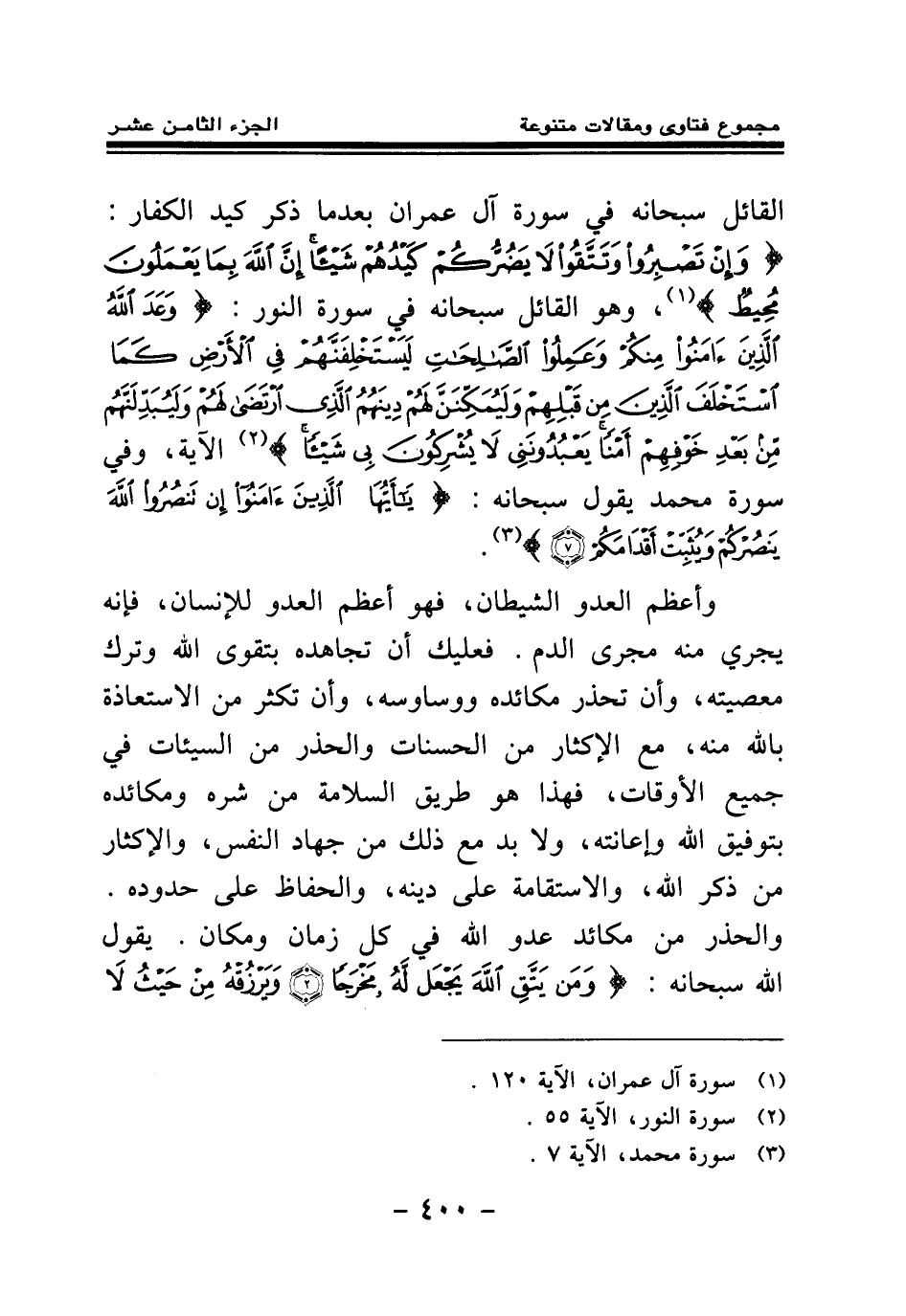 القائل سبحانه في سورة آل عمران بعدما ذكر كيد الكفار: {وَإِنْ تَصْبِرُوا وَتَتَّقُوا لَا يَضُرُّكُمْ كَيْدُهُمْ شَيْئًا إِنَّ اللَّهَ بِمَا يَعْمَلُونَ مُحِيطٌ} (¬1) وهو القائل سبحانه في سورة النور: {وَعَدَ اللَّهُ الَّذِينَ آمَنُوا مِنْكُمْ وَعَمِلُوا الصَّالِحَاتِ لَيَسْتَخْلِفَنَّهُمْ فِي الْأَرْضِ كَمَا اسْتَخْلَفَ الَّذِينَ مِنْ قَبْلِهِمْ وَلَيُمَكِّنَنَّ لَهُمْ دِينَهُمُ الَّذِي ارْتَضَى لَهُمْ وَلَيُبَدِّلَنَّهُمْ مِنْ بَعْدِ خَوْفِهِمْ أَمْنًا يَعْبُدُونَنِي لَا يُشْرِكُونَ بِي شَيْئًا} (¬2) الآية، وفي سورة محمد يقول سبحانه: {يَا أَيُّهَا الَّذِينَ آمَنُوا إِنْ تَنْصُرُوا اللَّهَ يَنْصُرْكُمْ وَيُثَبِّتْ أَقْدَامَكُمْ} (¬3)