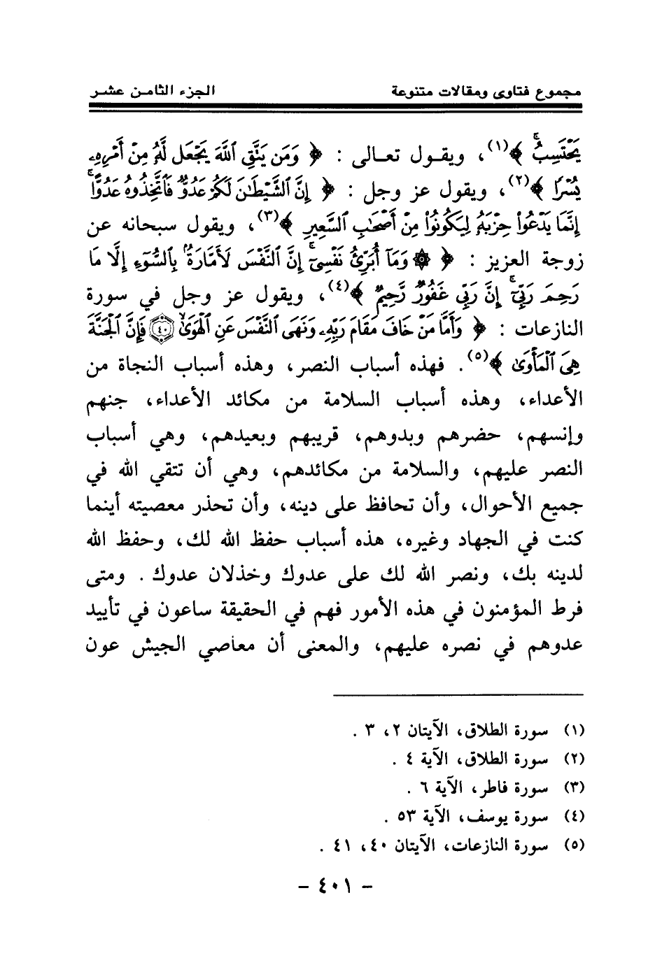 ويقول تعالى: {وَمَنْ يَتَّقِ اللَّهَ يَجْعَلْ لَهُ مِنْ أَمْرِهِ يُسْرًا} (¬1) ويقول عز وجل: {إِنَّ الشَّيْطَانَ لَكُمْ عَدُوٌّ فَاتَّخِذُوهُ عَدُوًّا إِنَّمَا يَدْعُو حِزْبَهُ لِيَكُونُوا مِنْ أَصْحَابِ السَّعِيرِ} (¬2) ويقول سبحانه عن زوجة العزيز: {وَمَا أُبَرِّئُ نَفْسِي إِنَّ النَّفْسَ لَأَمَّارَةٌ بِالسُّوءِ إِلَّا مَا رَحِمَ رَبِّي إِنَّ رَبِّي غَفُورٌ رَحِيمٌ} (¬3) ويقول عز وجل في سورة النازعات: {وَأَمَّا مَنْ خَافَ مَقَامَ رَبِّهِ وَنَهَى النَّفْسَ عَنِ الْهَوَى} (¬4) {فَإِنَّ الْجَنَّةَ هِيَ الْمَأْوَى} (¬5) فهذه أسباب النصر، وهذه أسباب النجاة من الأعداء، وهذه أسباب السلامة من مكائد الأعداء، جنهم وإنسهم، حضرهم وبدوهم، قريبهم وبعيدهم، وهي أسباب النصر عليهم، والسلامة من مكائدهم، وهي أن تتقي الله في جميع الأحوال، وأن تحافظ على دينه، وأن تحذر معصيته أينما كنت في الجهاد وغيره، هذه أسباب حفظ الله لك، وحفظ الله لدينه بك، ونصر الله لك على عدوك وخذلان عدوك. ومتى فرط المؤمنون في هذه الأمور فهم في الحقيقة ساعون في تأييد عدوهم في نصره عليهم، والمعنى أن معاصي الجيش عون