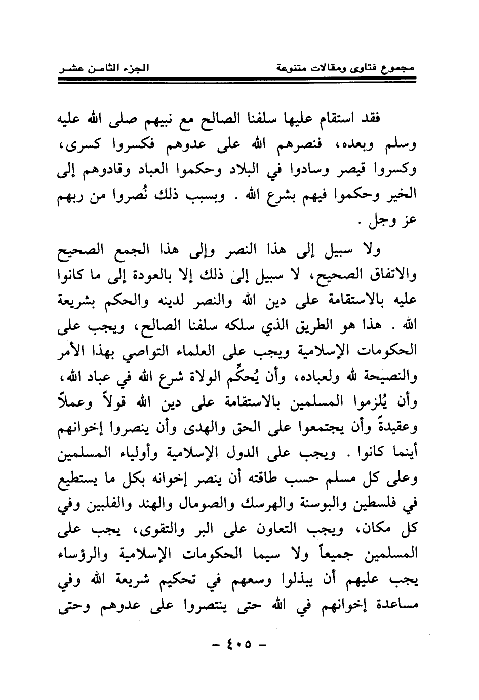 ولا سبيل إلى هذا النصر وإلى هذا الجمع الصحيح والاتفاق الصحيح، لا سبيل إلى ذلك إلا بالعودة إلى ما كانوا عليه بالاستقامة على دين الله والنصر لدينه والحكم بشريعة الله. هذا هو الطريق الذي سلكه سلفنا الصالح، ويجب على الحكومات الإسلامية ويجب على العلماء التواصي بهذا الأمر والنصيحة لله ولعباده، وأن يحكم الولاة شرع الله في عباد الله، وأن يلزموا المسلمين بالاستقامة على دين الله قولا وعملا وعقيدة وأن يجتمعوا على الحق والهدى وأن ينصروا إخوانهم أينما كانوا. ويجب على الدول الإسلامية وأولياء المسلمين وعلى كل مسلم حسب طاقته أن ينصر إخوانه بكل ما يستطيع في فلسطين والبوسنة والهرسك والصومال والهند والفلبين وفي كل مكان، ويجب التعاون على البر والتقوى، يجب على المسلمين جميعا ولا سيما الحكومات الإسلامية والرؤساء يجب عليهم أن يبذلوا وسعهم في تحكيم شريعة الله وفي مساعدة إخوانهم في الله حتى ينتصروا على عدوهم وحتى
