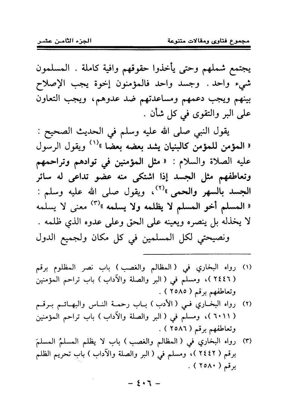 يجتمع شملهم وحتى يأخذوا حقوقهم وافية كاملة. المسلمون شيء واحد. وجسد واحد فالمؤمنون إخوة يجب الإصلاح بينهم ويجب دعمهم ومساعدتهم ضد عدوهم، ويجب التعاون على البر والتقوى في كل شأن. يقول النبي صلى الله عليه وسلم في الحديث الصحيح: «المؤمن للمؤمن كالبنيان يشد بعضه بعضا (¬1) » ويقول الرسول عليه الصلاة والسلام: «مثل المؤمنين في توادهم وتراحمهم وتعاطفهم مثل الجسد إذا اشتكى منه عضو تداعى له سائر الجسد بالسهر والحمى (¬2) » ، ويقول صلى الله عليه وسلم: «المسلم أخو المسلم لا يظلمه ولا يسلمه (¬3) » معنى لا يسلمه لا يخذله بل ينصره ويعينه على الحق وعلى عدوه الذي ظلمه.