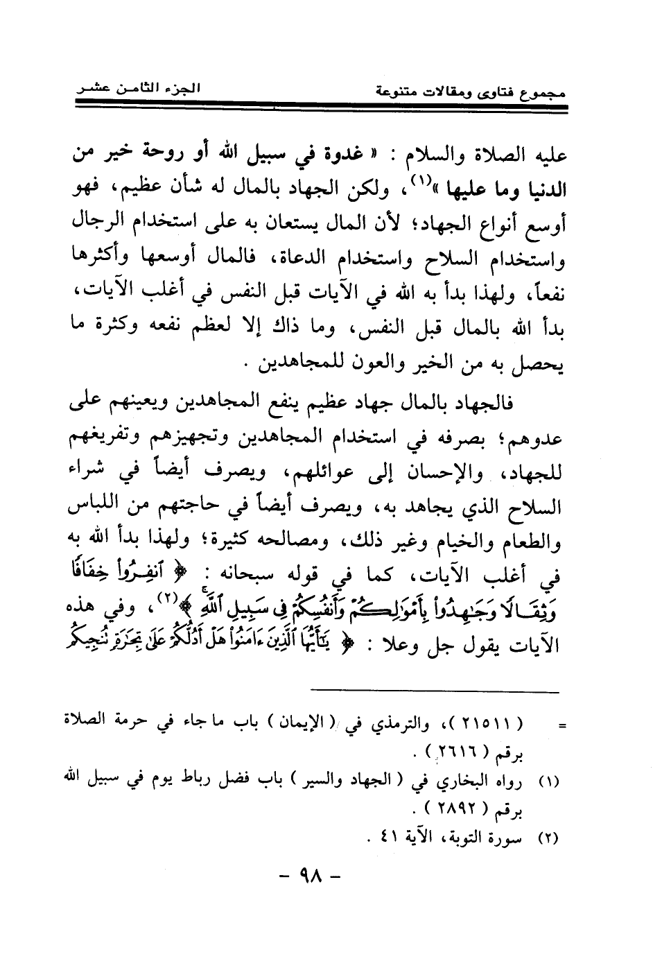 عليه الصلاة والسلام: «غدوة في سبيل الله أو روحة خير من الدنيا وما عليها (¬1) » ، ولكن الجهاد بالمال له شأن عظيم، فهو أوسع أنواع الجهاد؛ لأن المال يستعان به على استخدام الرجال، واستخدام السلاح، واستخدام الدعاة، فالمال أوسعها وأكثرها نفعا، ولهذا بدأ به الله في الآيات قبل النفس في أغلب الآيات، بدأ الله بالمال قبل النفس، وما ذاك إلا لعظم نفعه وكثرة ما يحصل به من الخير والعون للمجاهدين.