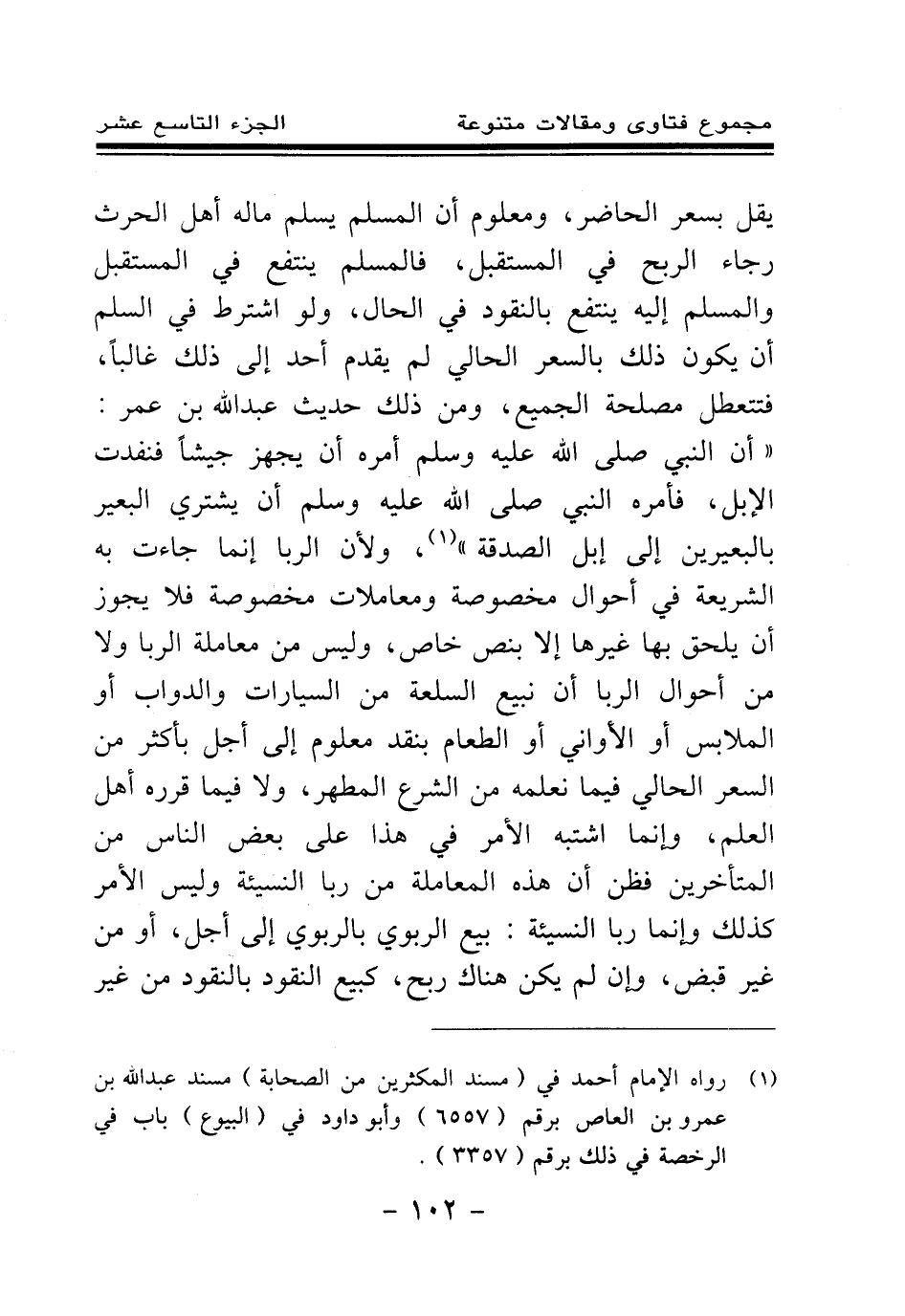 يقل بسعر الحاضر، ومعلوم أن المسلم يسلم ماله أهل الحرث رجاء الربح في المستقبل، فالمسلم ينتفع في المستقبل والمسلم إليه ينتفع بالنقود في الحال، ولو اشترط في السلم أن يكون ذلك بالسعر الحالي لم يقدم أحد إلى ذلك غالبا، فتتعطل مصلحة الجميع، ومن ذلك حديث عبد الله بن عمر: «أن النبي صلى الله عليه وسلم أمره أن يجهز جيشا فنفدت الإبل، فأمره النبي صلى الله عليه وسلم أن يشتري البعير بالبعيرين إلى إبل الصدقة (¬1) » ، ولأن الربا إنما جاءت به الشريعة في أحوال مخصوصة ومعاملات مخصوصة فلا يجوز أن يلحق بها غيرها إلا بنص خاص، وليس من معاملة الربا ولا من أحوال الربا أن نبيع السلعة من السيارات والدواب أو الملابس أو الأواني أو الطعام بنقد معلوم إلى أجل بأكثر من السعر الحالي فيما نعلمه من الشرع المطهر، ولا فيما قرره أهل العلم، وإنما اشتبه الأمر في هذا على بعض الناس من المتأخرين فظن أن هذه المعاملة من ربا النسيئة وليس الأمر كذلك وإنما ربا النسيئة: بيع الربوي بالربوي إلى أجل، أو من غير قبض، وإن لم يكن هناك ربح، كبيع النقود بالنقود من غير