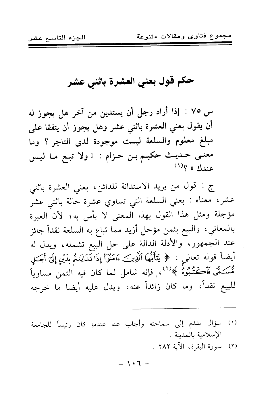 ج: قول من يريد الاستدانة للدائن، بعني العشرة باثني عشر، معناه: بعني السلعة التي تساوي عشرة حالة باثني عشر مؤجلة ومثل هذا القول بهذا المعنى لا بأس به؛ لأن العبرة بالمعاني، والبيع بثمن مؤجل أزيد مما تباع به السلعة نقدا جائز عند الجمهور، والأدلة الدالة على حل البيع تشمله، ويدل له أيضا قوله تعالى: {يَا أَيُّهَا الَّذِينَ آمَنُوا إِذَا تَدَايَنْتُمْ بِدَيْنٍ إِلَى أَجَلٍ مُسَمًّى فَاكْتُبُوهُ} (¬3) فإنه شامل لما كان فيه الثمن مساويا للبيع نقدا؛ وما كان زائدا عنه، ويدل عليه أيضا ما خرجه