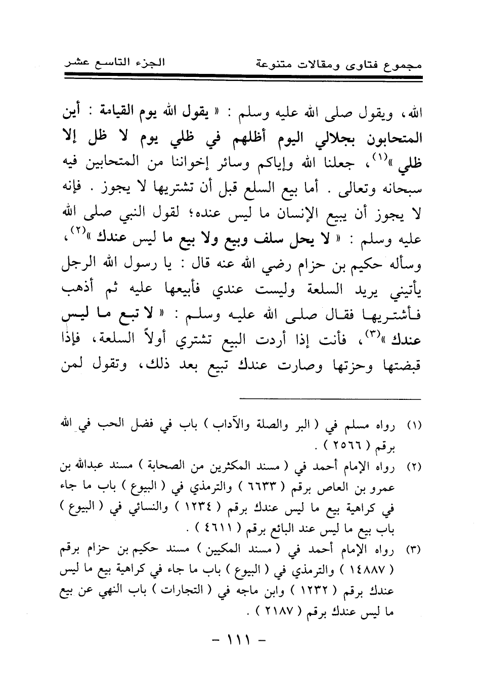 (¬3) رواه الإمام أحمد في (مسند المكيين) مسند حكيم بن حزام برقم (14887) والترمذي في (البيوع) باب ما جاء في كراهية بيع ما ليس عندك برقم (1232) وابن ماجه في (التجارات) باب النهي عن بيع ما ليس عندك برقم (2187) .