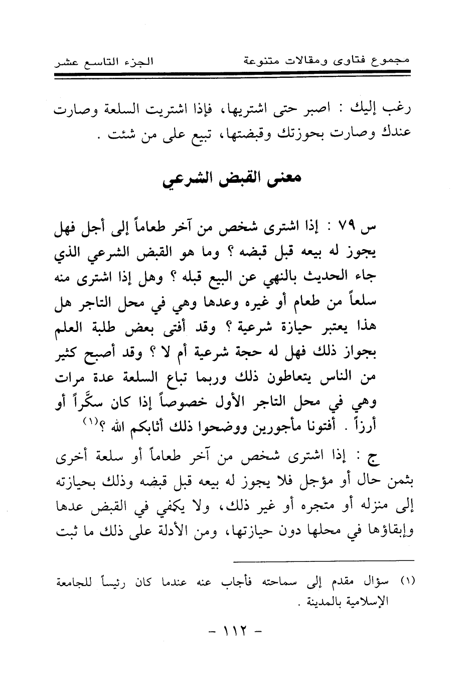 س 79: إذا اشترى شخص من آخر طعاما إلى أجل فهل يجوز له بيعه قبل قبضه؟ وما هو القبض الشرعي الذي جاء الحديث بالنهي عن البيع قبله؟ وهل إذا اشترى منه سلعا من طعام أو غيره وعدها وهي في محل التاجر هل هذا يعتبر حيازة شرعية؟ وقد أفتى بعض طلبة العلم بجواز ذلك فهل له حجة شرعية أم لا؟ وقد أصبح كثير من الناس يتعاطون ذلك وربما تباع السلعة عدة مرات وهي في محل التاجر الأول خصوصا إذا كان سكرا أو أرزا. أفتونا مأجورين ووضحوا ذلك أثابكم الله؟ (¬1)