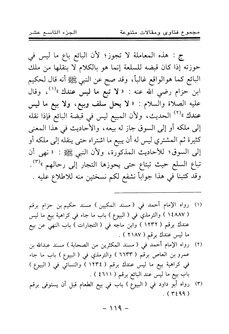 (¬2) رواه الإمام أحمد في (مسند المكثرين من الصحابة) مسند عبد الله بن عمرو بن العاص برقم (6633) والترمذي في (البيوع) باب ما جاء في كراهية بيع ما ليس عندك برقم (1234) والنسائي في (البيوع) باب بيع ما ليس عند البائع برقم (4611) .
