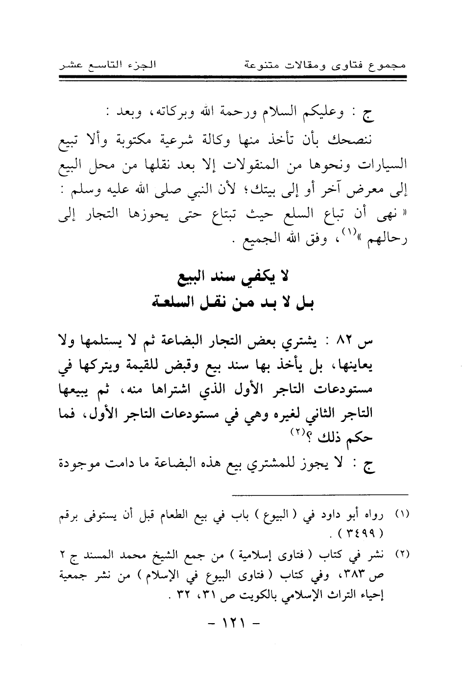 س 82: يشتري بعض التجار البضاعة ثم لا يتسلمها ولا يعاينها، بل يأخذ بها سند بيع وقبض للقيمة ويتركها في مستودعات التاجر الأول الذي اشتراها منه، ثم يبيعها التاجر الثاني لغيره وهي في مستودعات التاجر الأول، فما حكم ذلك؟