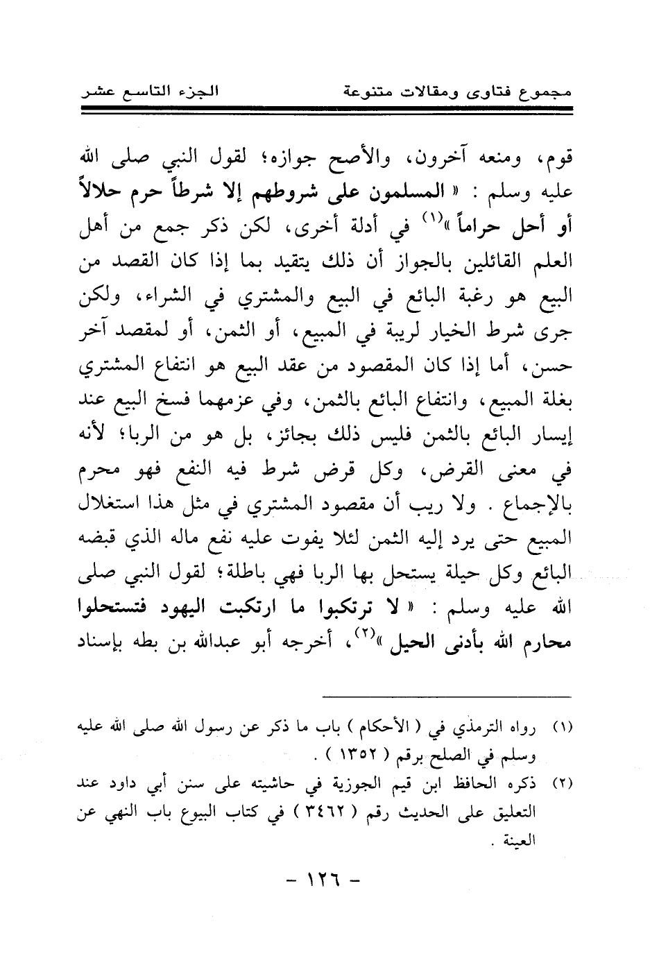 ولا ريب أن مقصود المشتري في مثل هذا استغلال المبيع حتى يرد إليه الثمن لئلا يفوت عليه نفع ماله الذي قبضه البائع وكل حيلة يستحل بها الربا فهي باطلة؛ لقول النبي صلى الله عليه وسلم: «لا ترتكبوا ما ارتكبت اليهود فتستحلوا محارم الله بأدنى الحيل (¬2) » ، أخرجه أبو عبد الله بن بطة بإسناد