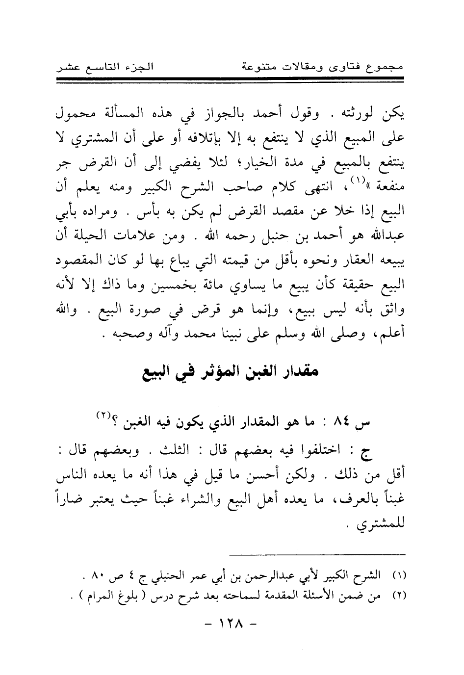 يكن لورثته. وقول أحمد بالجواز في هذه المسألة محمول على المبيع الذي لا ينتفع به إلا بإتلافه أو على أن المشتري لا ينتفع بالمبيع في مدة الخيار؛ لئلا يفضي إلى أن القرض جر منفعة " (¬1) ، انتهى كلام صاحب الشرح الكبير ومنه يعلم أن البيع إذا خلا عن مقصد القرض لم يكن به بأس. ومراده بأبي عبد الله هو أحمد بن حنبل رحمه الله. ومن علامات الحيلة أن يبيعه العقار ونحوه بأقل من قيمته التي يباع بها لو كان المقصود البيع حقيقة كأن يبيع ما يساوي مائة بخمسين وما ذاك إلا أنه واثق بأنه ليس ببيع، وإنما هو قرض في صورة البيع. والله أعلم، وصلى الله وسلم على نبينا محمد وآله وصحبه.