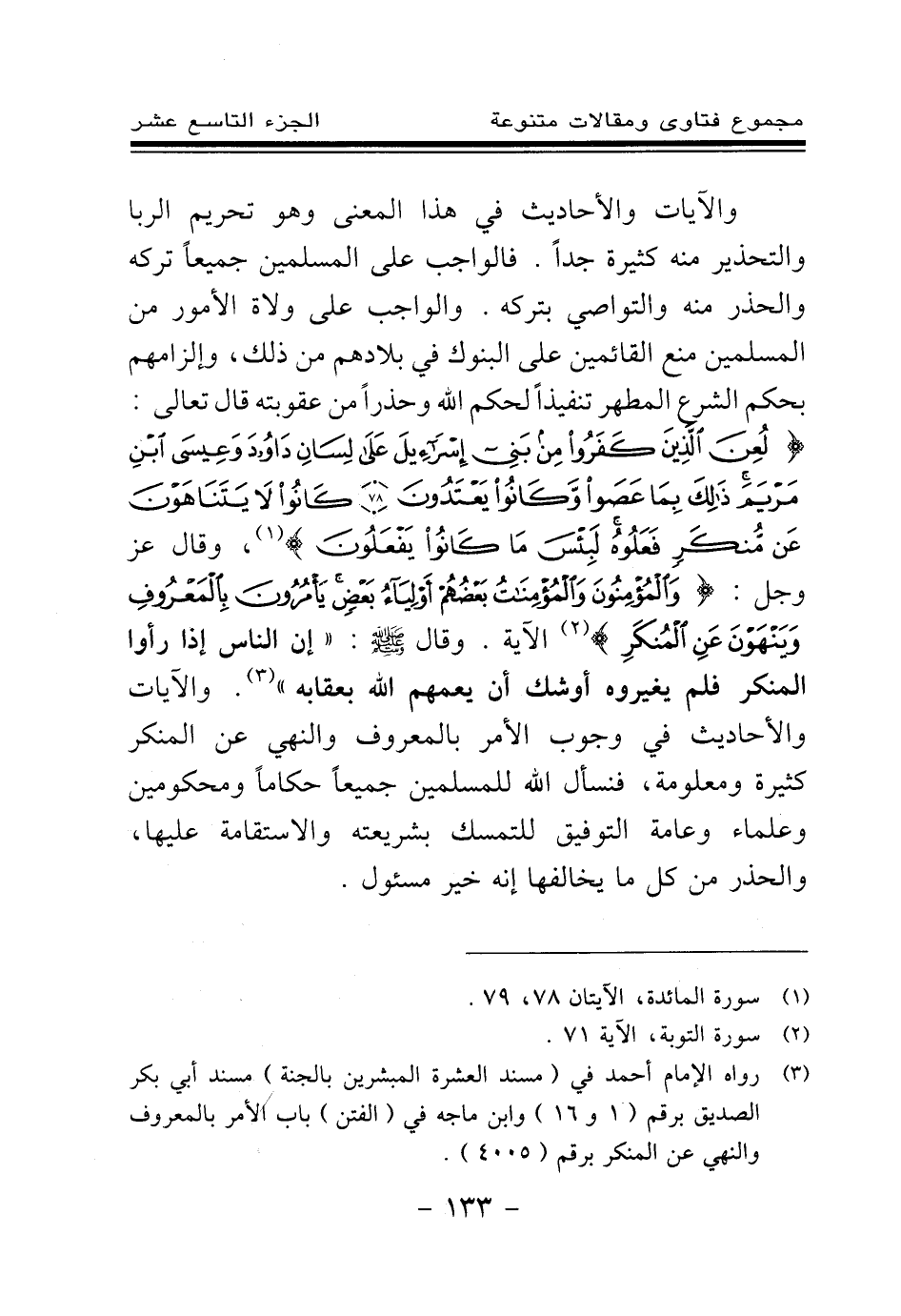 والآيات والأحاديث في هذا المعنى وهو تحريم الربا والتحذير منه كثيرة جدا. فالواجب على المسلمين جميعا تركه والحذر منه والتواصي بتركه. والواجب على ولاة الأمور من المسلمين منع القائمين على البنوك في بلادهم من ذلك، وإلزامهم بحكم الشرع المطهر تنفيذا لحكم الله وحذرا من عقوبته قال تعالى: {لُعِنَ الَّذِينَ كَفَرُوا مِنْ بَنِي إِسْرَائِيلَ عَلَى لِسَانِ دَاوُدَ وَعِيسَى ابْنِ مَرْيَمَ ذَلِكَ بِمَا عَصَوْا وَكَانُوا يَعْتَدُونَ} (¬1) {كَانُوا لَا يَتَنَاهَوْنَ عَنْ مُنْكَرٍ فَعَلُوهُ لَبِئْسَ مَا كَانُوا يَفْعَلُونَ} (¬2) وقال عز وجل: {وَالْمُؤْمِنُونَ وَالْمُؤْمِنَاتُ بَعْضُهُمْ أَوْلِيَاءُ بَعْضٍ يَأْمُرُونَ بِالْمَعْرُوفِ وَيَنْهَوْنَ عَنِ الْمُنْكَرِ} (¬3) الآية. وقال صلى الله عليه وسلم: «إن الناس إذا رأوا المنكر فلم يغيروه أوشك أن يعمهم الله بعقابه (¬4) » . والآيات والأحاديث في وجوب الأمر بالمعروف والنهي عن المنكر كثيرة ومعلومة، فنسأل الله للمسلمين جميعا حكاما ومحكومين وعلماء عامة التوفيق للتمسك بشريعته والاستقامة عليها، والحذر من كل ما يخالفها إنه خير مسئول.