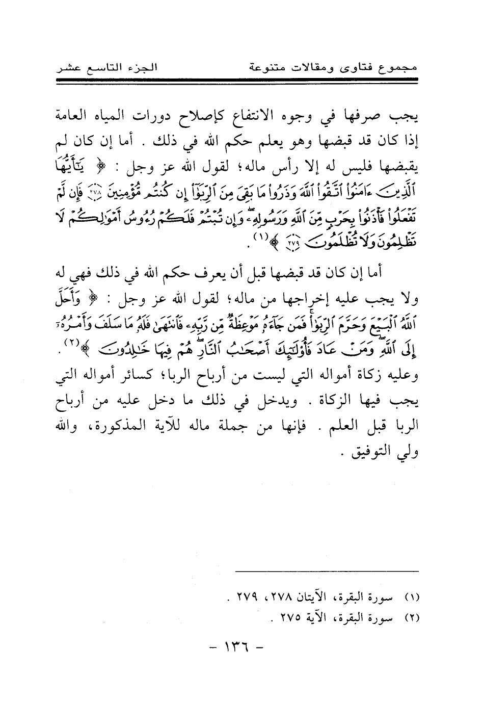 يجب صرفها في وجوه الانتفاع كإصلاح دورات المياه العامة إذا كان قد قبضها وهو يعلم حكم الله في ذلك. أما إذا كان لم يقبضها فليس له إلا رأس ماله؛ لقول الله عز وجل: {يَا أَيُّهَا الَّذِينَ آمَنُوا اتَّقُوا اللَّهَ وَذَرُوا مَا بَقِيَ مِنَ الرِّبَا إِنْ كُنْتُمْ مُؤْمِنِينَ} (¬1) {فَإِنْ لَمْ تَفْعَلُوا فَأْذَنُوا بِحَرْبٍ مِنَ اللَّهِ وَرَسُولِهِ وَإِنْ تُبْتُمْ فَلَكُمْ رُءُوسُ أَمْوَالِكُمْ لَا تَظْلِمُونَ وَلَا تُظْلَمُونَ} (¬2)