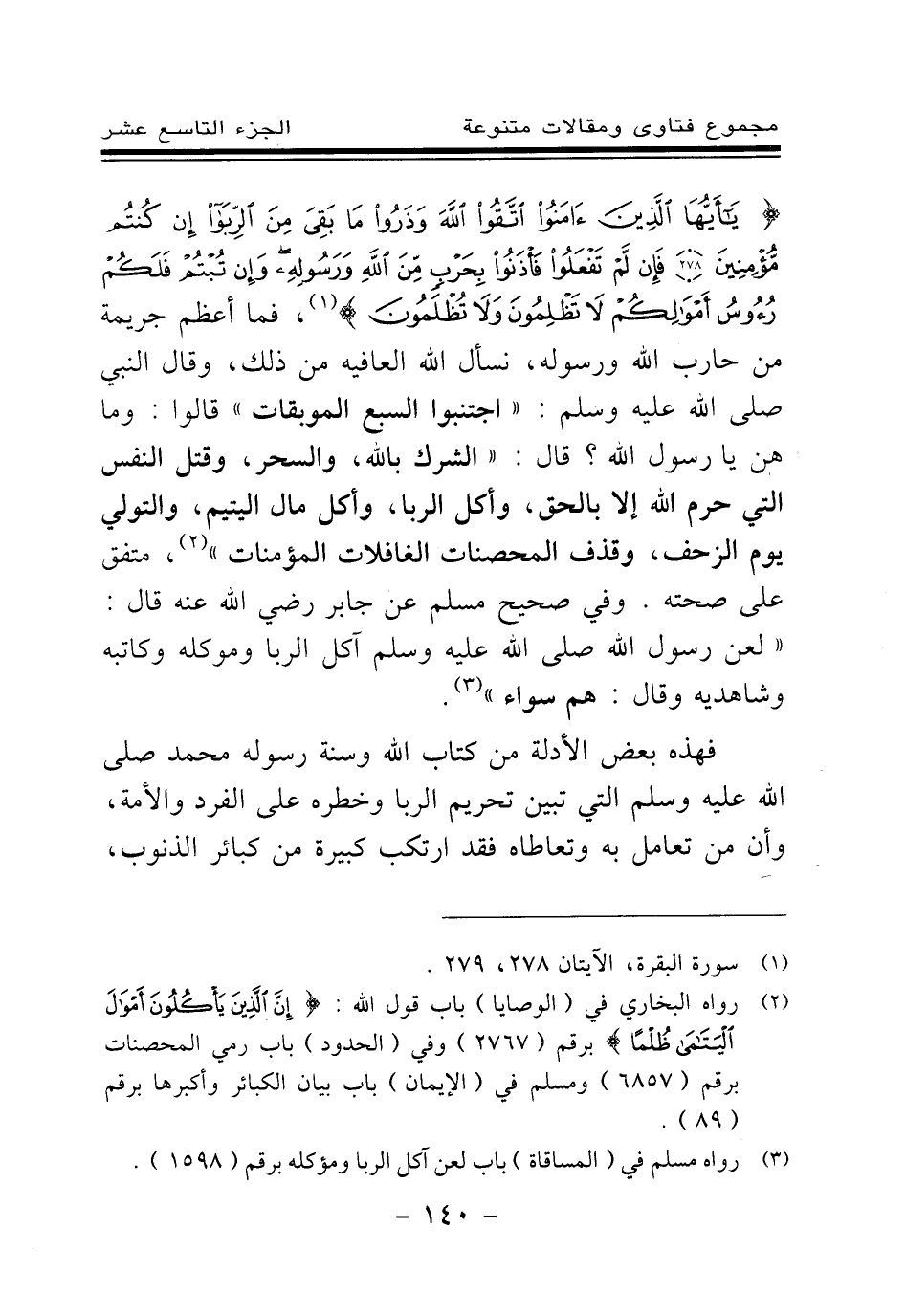 {يَا أَيُّهَا الَّذِينَ آمَنُوا اتَّقُوا اللَّهَ وَذَرُوا مَا بَقِيَ مِنَ الرِّبَا إِنْ كُنْتُمْ مُؤْمِنِينَ} (¬1) {فَإِنْ لَمْ تَفْعَلُوا فَأْذَنُوا بِحَرْبٍ مِنَ اللَّهِ وَرَسُولِهِ وَإِنْ تُبْتُمْ فَلَكُمْ رُءُوسُ أَمْوَالِكُمْ لَا تَظْلِمُونَ وَلَا تُظْلَمُونَ} (¬2) فما أعظم جريمة من حارب الله ورسوله، نسأل الله العافية من ذلك، وقال النبي صلى الله عليه وسلم: «اجتنبوا السبع الموبقات قالوا: وما هن يا رسول الله؟ قال: الشرك بالله، والسحر، وقتل النفس التي حرم الله إلا بالحق، وأكل الربا، وأكل مال اليتيم، والتولي يوم الزحف، وقذف المحصنات الغافلات المؤمنات (¬3) » ، متفق على صحته. وفي صحيح مسلم عن جابر رضي الله عنه قال: «لعن رسول الله صلى الله عليه وسلم آكل الربا وموكله وكاتبه وشاهديه وقال: هو سواء (¬4) » .