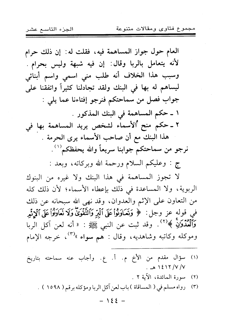 لا تجوز المساهمة في هذا البنك ولا غيره من البنوك الربوية، ولا المساعدة في ذلك بإعطاء الأسماء؛ لأن ذلك كله من التعاون على الإثم والعدوان، وقد نهى الله سبحانه عن ذلك في قوله عز وجل: {وَتَعَاوَنُوا عَلَى الْبِرِّ وَالتَّقْوَى وَلَا تَعَاوَنُوا عَلَى الْإِثْمِ وَالْعُدْوَانِ} (¬2) وقد ثبت عن النبي صلى الله عليه وسلم: «أنه لعن آكل الربا وموكله وكاتبه وشاهديه، وقال: هم سواء (¬3) » ، خرجه الإمام