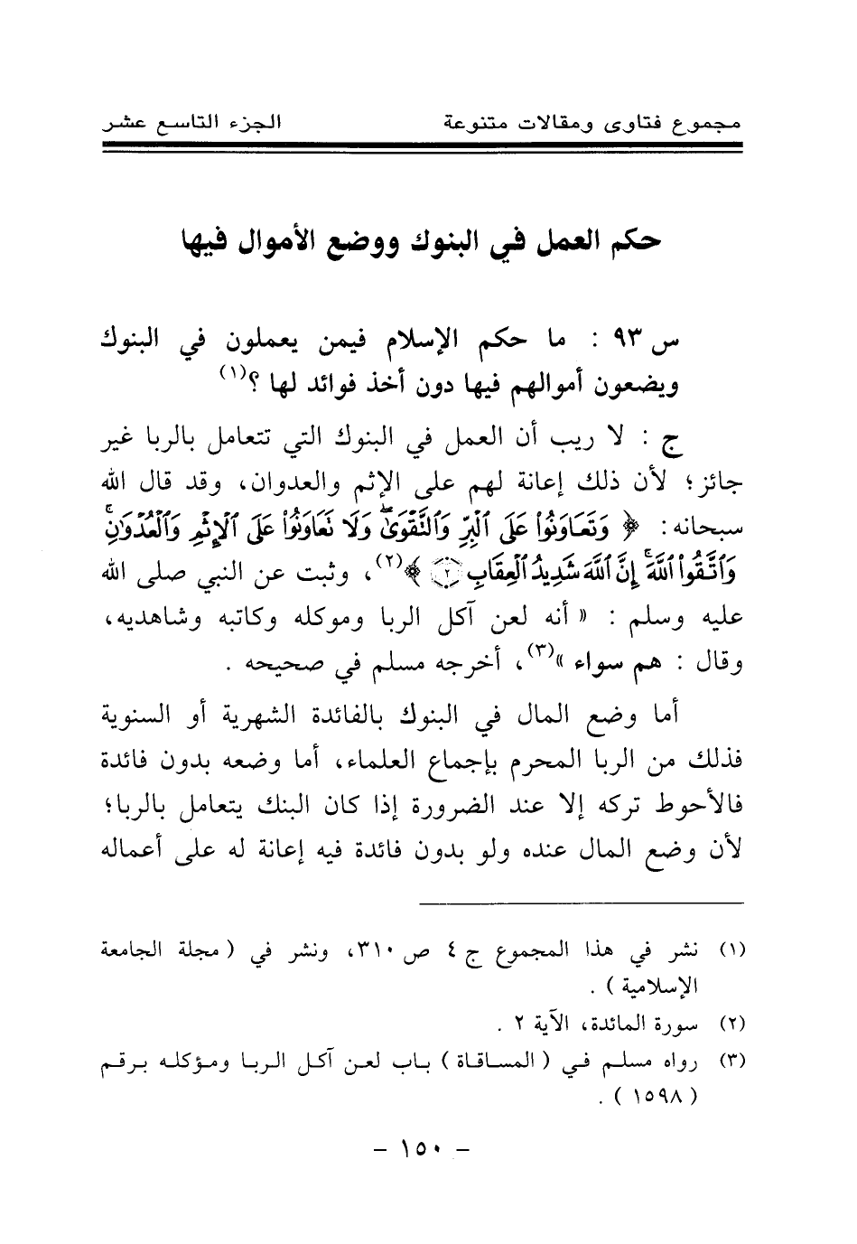 ج: لا ريب أن العمل في البنوك التي تتعامل بالربا غير جائز؛ لأن ذلك إعانة على الإثم والعدوان، وقد قال الله سبحانه: {وَتَعَاوَنُوا عَلَى الْبِرِّ وَالتَّقْوَى وَلَا تَعَاوَنُوا عَلَى الْإِثْمِ وَالْعُدْوَانِ وَاتَّقُوا اللَّهَ إِنَّ اللَّهَ شَدِيدُ الْعِقَابِ} (¬2) وقد ثبت عن النبي صلى الله عليه وسلم: «أنه لعن آكل الربا وموكله وكاتبه وشاهديه، وقال: هم سواء (¬3) » ، أخرجه مسلم في صحيحه.