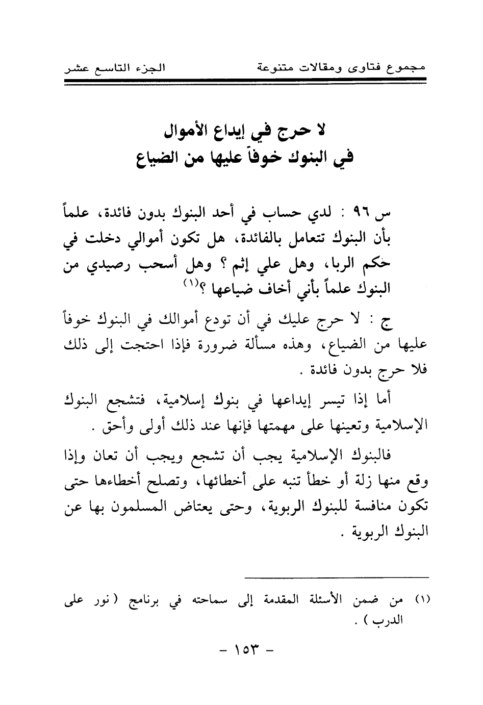 س 96: لدي حساب في أحد البنوك بدون فائدة، علما بأن البنوك تتعامل بالفائدة، هل تكون أموالي دخلت في حكم الربا، وهل علي إثم، وهل أسحب رصيدي من البنوك علما بأني أخاف ضياعها؟ (¬1)