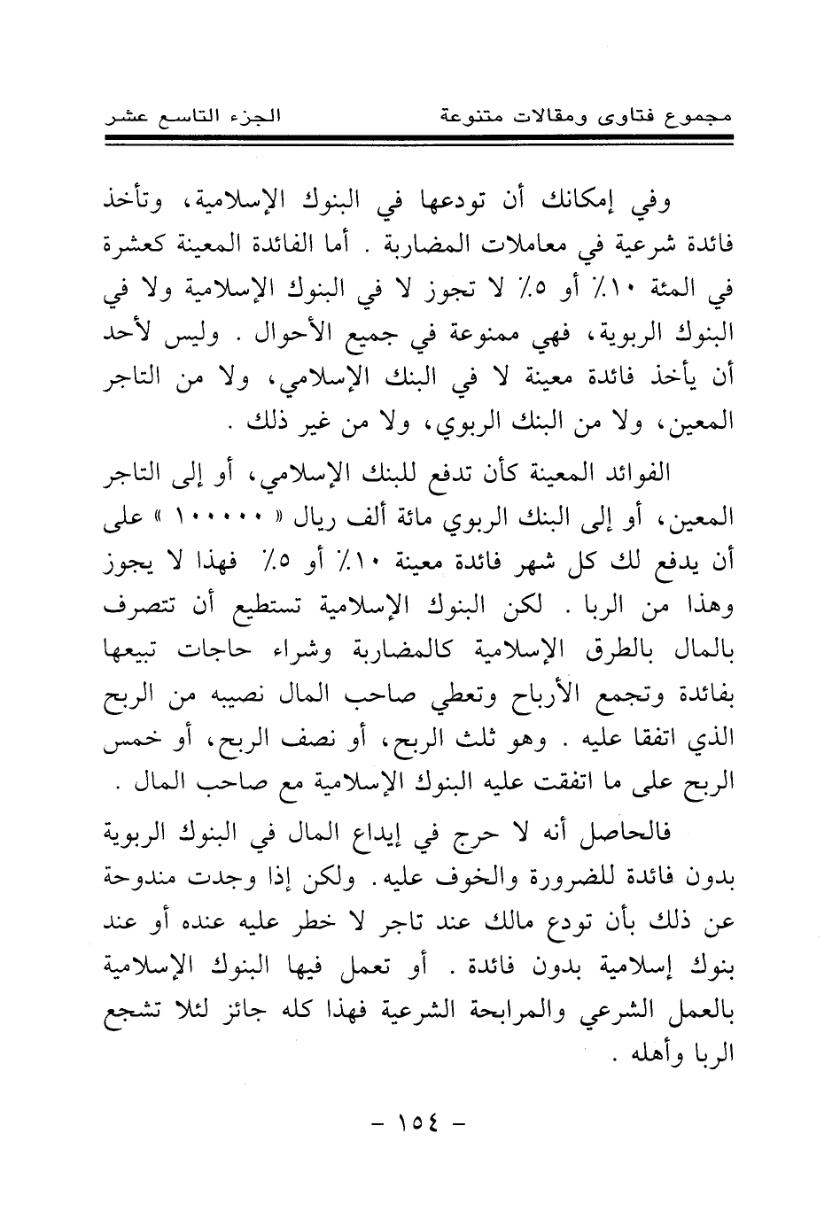 وفي إمكانك أن تودعها في البنوك الإسلامية، وتأخذ فائدة شرعية في معاملات المضاربة. أما الفائدة المعينة كعشرة في المئة10% أو 5% لا تجوز لا في البنوك الإسلامية ولا في البنوك الربوية، فهي ممنوعة في جميع الأحوال. وليس لأحد أن يأخذ فائدة معينة لا في البنك الإسلامي، ولا من التاجر المعين، ولا من البنك الربوي، ولا من غير ذلك.