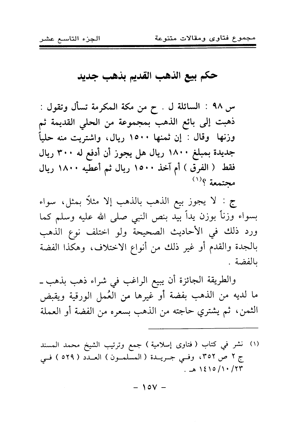 س98: السائلة ل. ح من مكة المكرمة تسأل وتقول: ذهبت إلى بائع الذهب بمجموعة من الحلي القديمة ثم وزنها وقال: إن ثمنها 1500 ريال، واشتريت منه حليا جديدة بمبلغ 1800 ريال هل يجوز أن أدفع له 300 ريال فقط (الفرق) أم آخذ 1500 ريال ثم أعطيه 1800 ريال مجتمعة؟