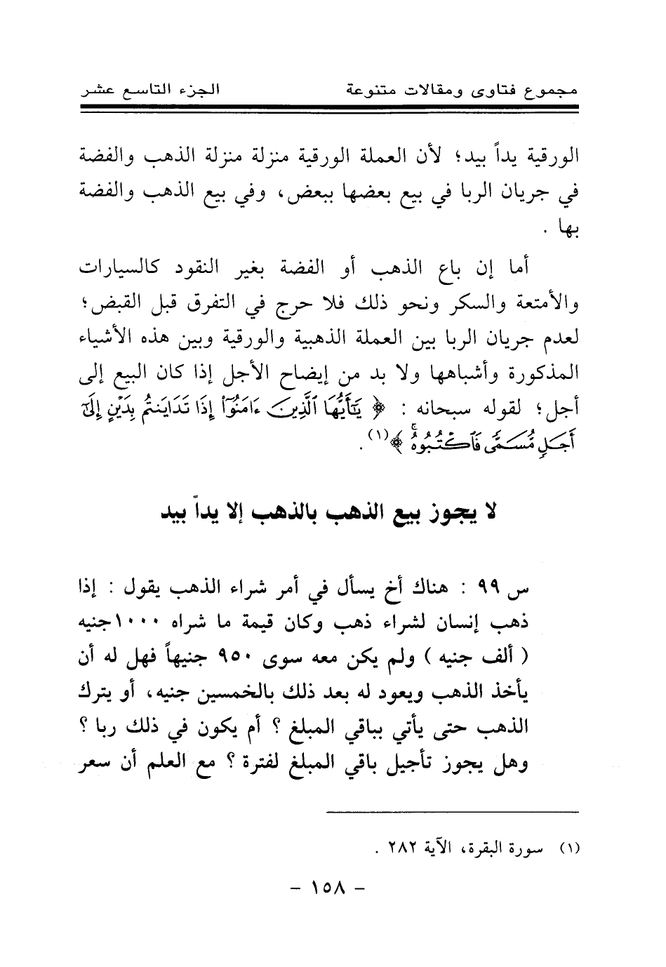س 99: هناك أخ يسأل في أمر شراء الذهب يقول: إذا ذهب إنسان لشراء ذهب وكان قيمة ما شراه 1000 جنيه (ألف جنيه) ولم يكن معه سوى 950 جنيها فهل له أن يأخذ الذهب ويعود له بعد ذلك بالخمسين جنيه، أو يترك الذهب حتى يأتي بباقي المبلغ؟ أم يكون في ذلك ربا؟ وهل يجوز تأجيل باقي المبلغ لفترة؟ مع العلم أن سعر