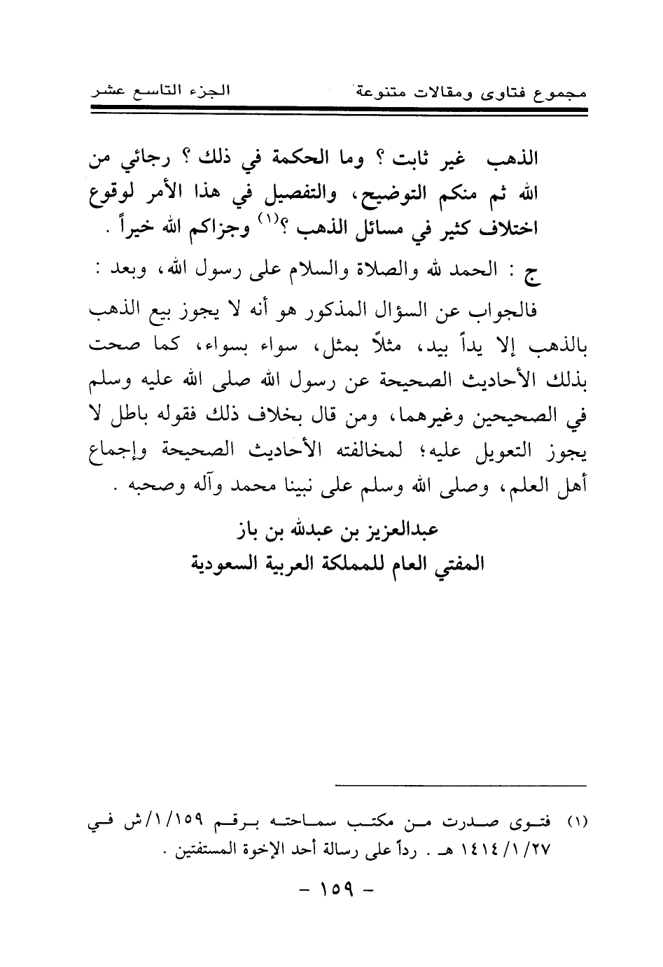 فالجواب عن السؤال المذكور هو أنه لا يجوز بيع الذهب بالذهب إلا يدا بيد، مثلا بمثل، سواء بسواء، كما صحت بذلك الأحاديث الصحيحة عن رسول الله صلى الله عليه وسلم في الصحيحين وغيرهما، ومن قال بخلاف ذلك فقوله باطل لا يجوز التعويل عليه؛ لمخالفته الأحاديث الصحيحة وإجماع أهل العلم، وصلى الله وسلم على نبينا محمد وآله وصحبه.