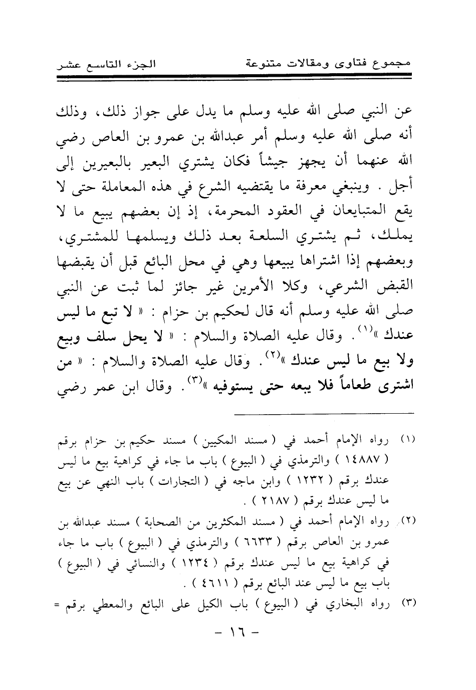 (¬2) رواه الإمام أحمد في (مسند المكثرين من الصحابة) مسند عبد الله بن عمرو بن العاص برقم (6633) والترمذي في (البيوع) باب ما جاء في كراهية بيع ما ليس عندك برقم (1234) والنسائي في (البيوع) باب بيع ما ليس عند البائع برقم (4611) .