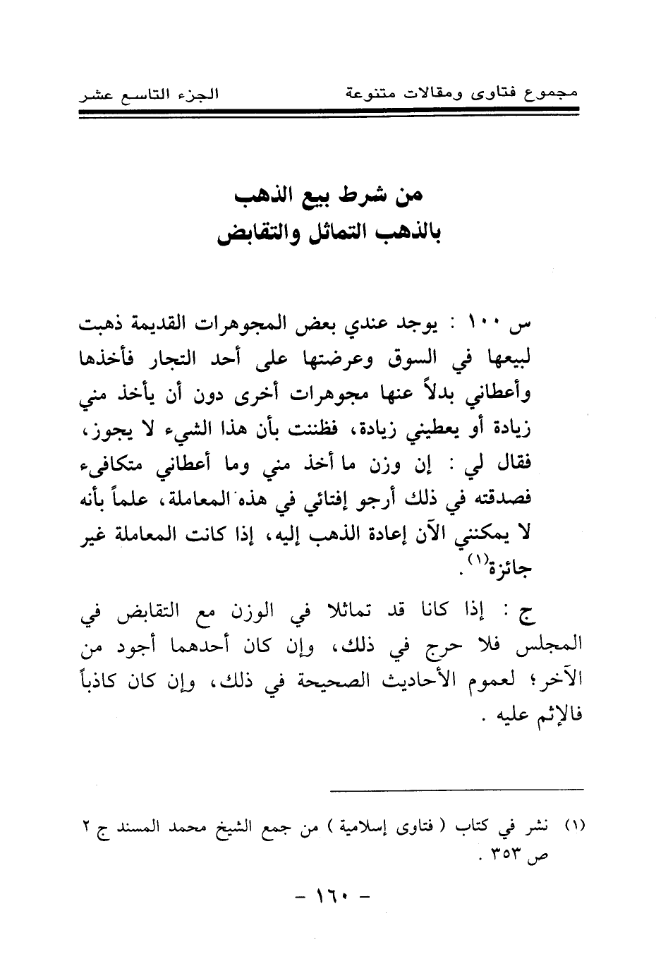 س 100: يوجد عندي بعض المجوهرات القديمة ذهبت لبيعها في السوق وعرضتها على أحد التجار فأخذها وأعطاني بدلا عنها مجوهرات أخرى دون أن يأخذ مني زيادة أو يعطيني زيادة، فظننت بأن هذا الشيء لا يجوز، فقال لي: إن وزن ما أخذ مني وما أعطاني متكافئ فصدقته في ذلك أرجو إفتائي في هذه المعاملة، علما بأنه لا يمكنني الآن إعادة الذهب إليه، إذا كانت المعاملة غير جائزة (¬1) .