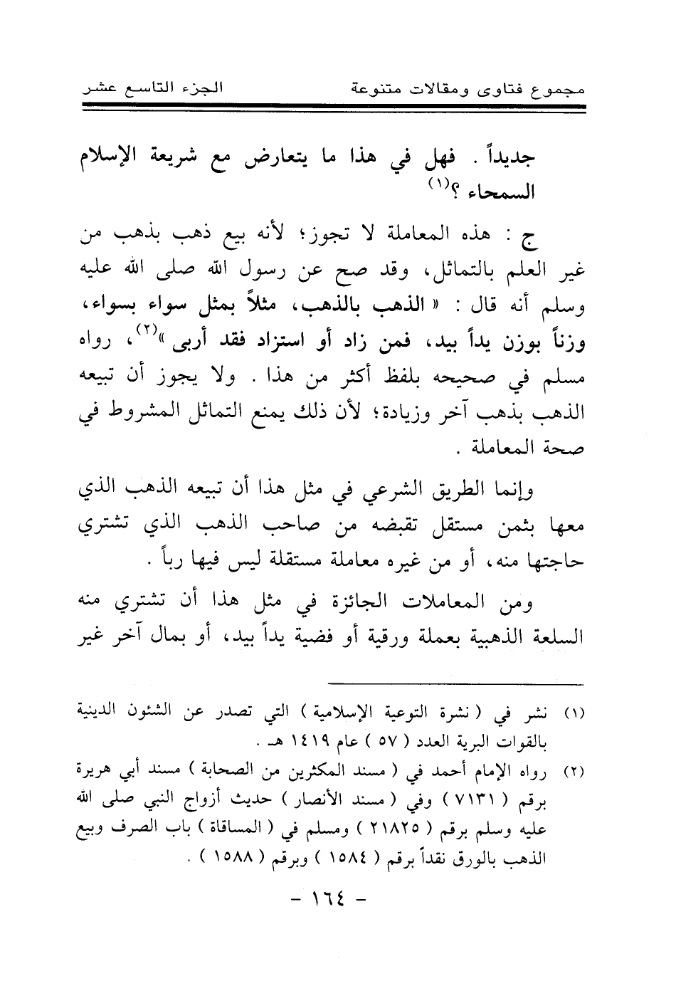 ج: هذه المعاملة لا تجوز؛ لأنه بيع ذهب بذهب من غير العلم بالتماثل، وقد صح عن رسول الله صلى الله عليه وسلم أنه قال: «الذهب بالذهب، مثلا بمثل سواء بسواء، وزنا بوزن يدا بيد، فمن زاد أو استزاد فقد أربى (¬1) » ، رواه مسلم في صحيحه بلفظ أكثر من هذا ولا يجوز أن تبيعه الذهب بذهب آخر؛ وزيادة لأن ذلك يمنع التماثل المشروط في صحة المعاملة.