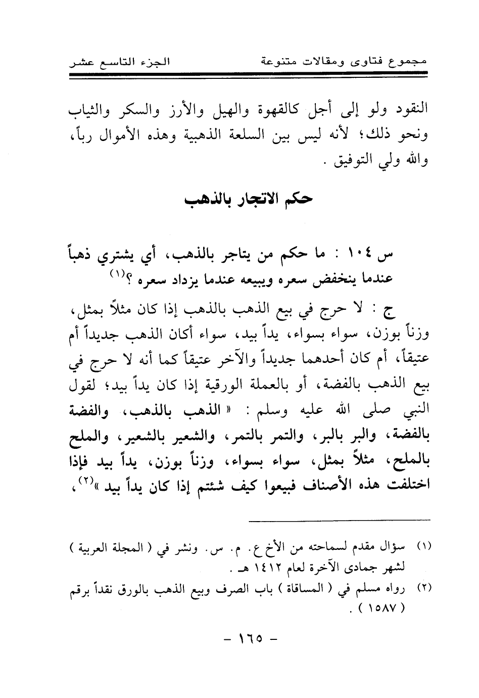 س 104: ما حكم من يتاجر بالذهب، أي يشتري ذهبا عندما ينخفض سعره ويبيعه عندما يزداد سعره؟ (¬1)