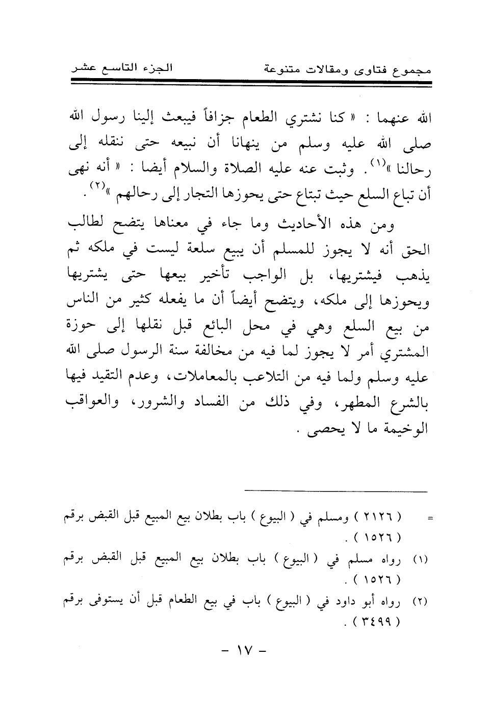 (¬1) رواه مسلم في (البيوع) باب بطلان بيع المبيع قبل القبض برقم (1526) .