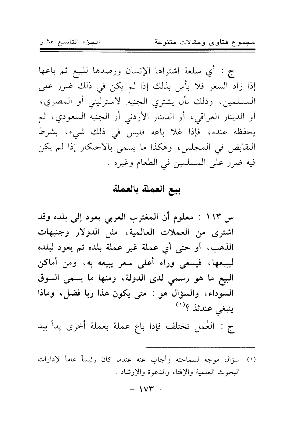 ج: أي سلعة اشتراها الإنسان ورصدها للبيع ثم باعها إذا زاد السعر فلا بأس بذلك إذا لم يكن في ذلك ضرر على المسلمين، وذلك بأن يشتري الجنيه الاسترليني أو المصري، أو الدينار العراقي، أو الدينار الأردني أو الجنيه السعودي، ثم يحفظه عنده، فإذا غلا باعه فليس في ذلك شيء، بشرط التقابض في المجلس، وهكذا ما يسمى بالاحتكار إذا لم يكن فيه ضرر على المسلمين في الطعام وغيره.