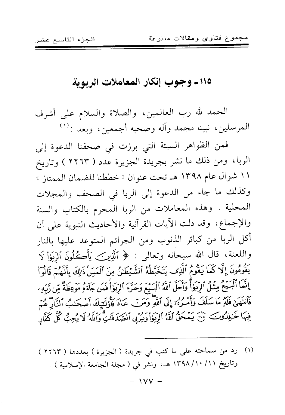 الحمد لله رب العالمين، والصلاة والسلام على أشرف المرسلين، نبينا محمد وآله وصحبه أجمعين، وبعد:. فمن الظواهر السيئة التي برزت في صحفنا الدعوة إلى الربا، ومن ذلك ما نشر بجريدة الجزيرة عدد (2263) وتاريخ 11 شوال عام 1398 هـ تحت عنوان "خططنا للضمان الممتاز" وكذلك ما جاء من الدعوة إلى الربا في الصحف والمجلات المحلية. وهذه المعاملات من الربا المحرم بالكتاب والسنة والإجماع، وقد دلت الآيات القرآنية والأحاديث النبوية على أن أكل الربا من كبائر الذنوب ومن الجرائم المتوعد عليها بالنار واللعنة، قال الله سبحانه وتعالى: {الَّذِينَ يَأْكُلُونَ الرِّبَا لَا يَقُومُونَ إِلَّا كَمَا يَقُومُ الَّذِي يَتَخَبَّطُهُ الشَّيْطَانُ مِنَ الْمَسِّ ذَلِكَ بِأَنَّهُمْ قَالُوا إِنَّمَا الْبَيْعُ مِثْلُ الرِّبَا وَأَحَلَّ اللَّهُ الْبَيْعَ وَحَرَّمَ الرِّبَا فَمَنْ جَاءَهُ مَوْعِظَةٌ مِنْ رَبِّهِ فَانْتَهَى فَلَهُ مَا سَلَفَ وَأَمْرُهُ إِلَى اللَّهِ وَمَنْ عَادَ فَأُولَئِكَ أَصْحَابُ النَّارِ هُمْ فِيهَا خَالِدُونَ} (¬1) {يَمْحَقُ اللَّهُ الرِّبَا وَيُرْبِي الصَّدَقَاتِ وَاللَّهُ لَا يُحِبُّ كُلَّ كَفَّارٍ أَثِيمٍ} (¬2)